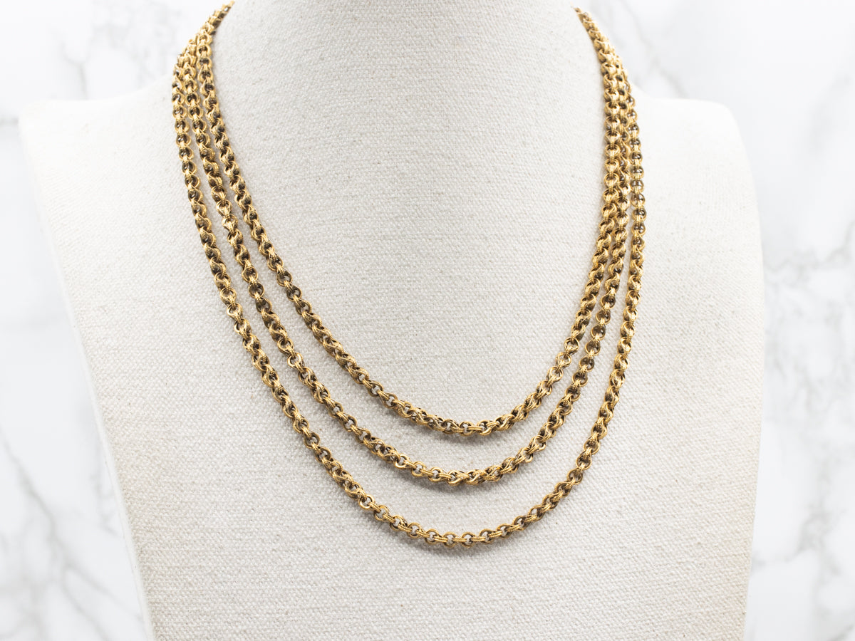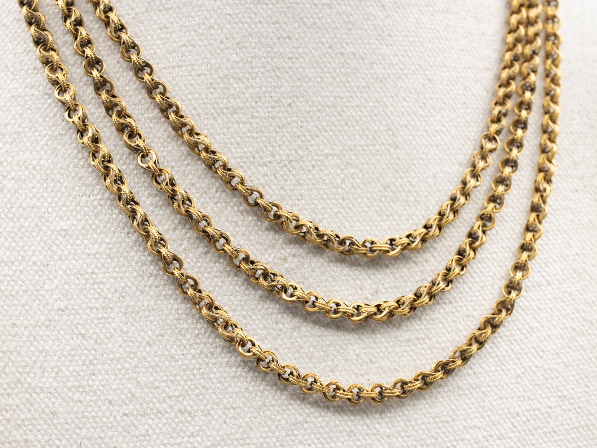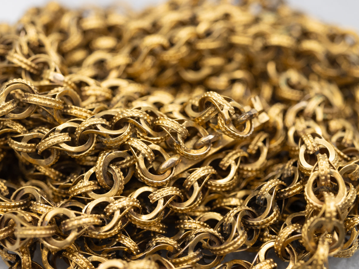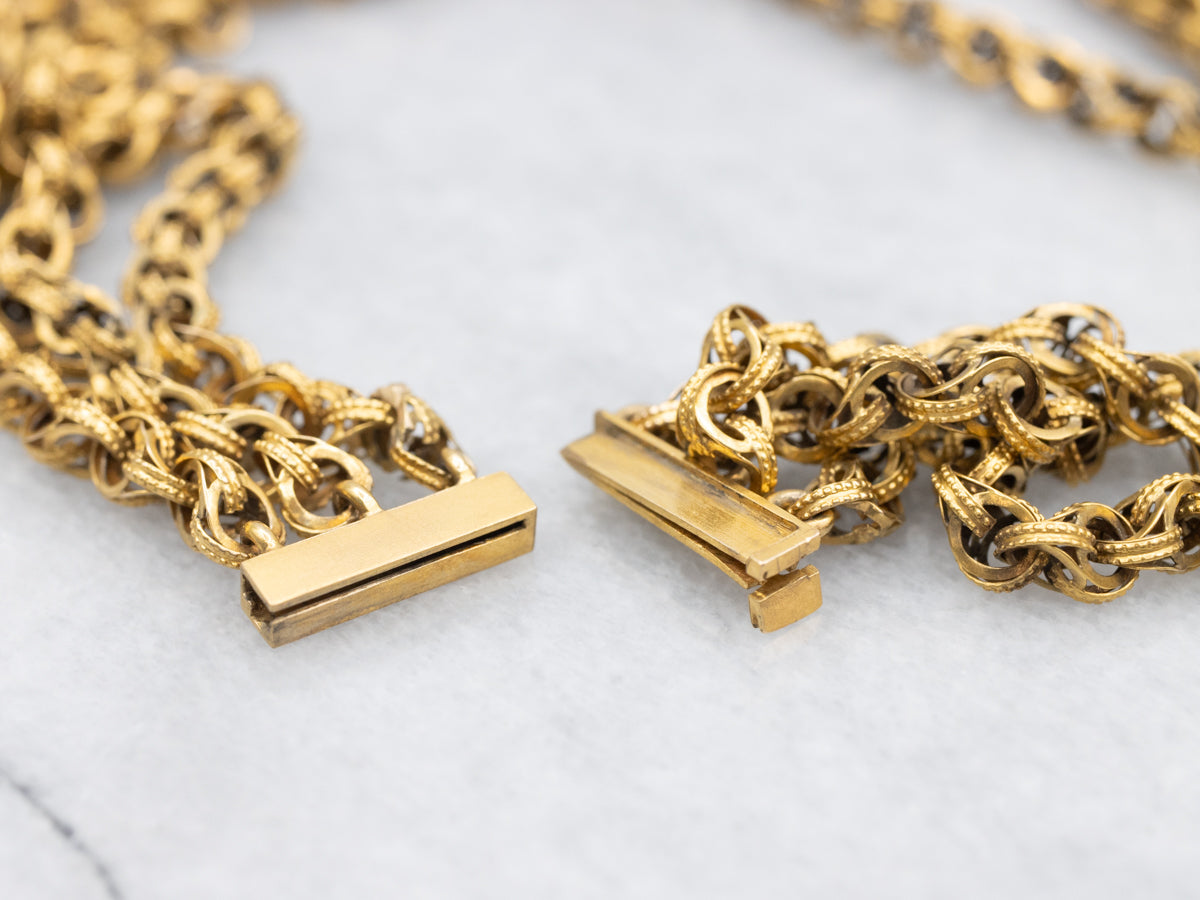 This vintage necklace will look lovely worn under a simple collar, or as a rich statement piece against a cocktail dress. Each chain is a made of small, double round links, formed together in a linking serpentine pattern. Styled after the styles of the 1800's, this gorgeous, heirloom quality piece dates the Victorian revival period.