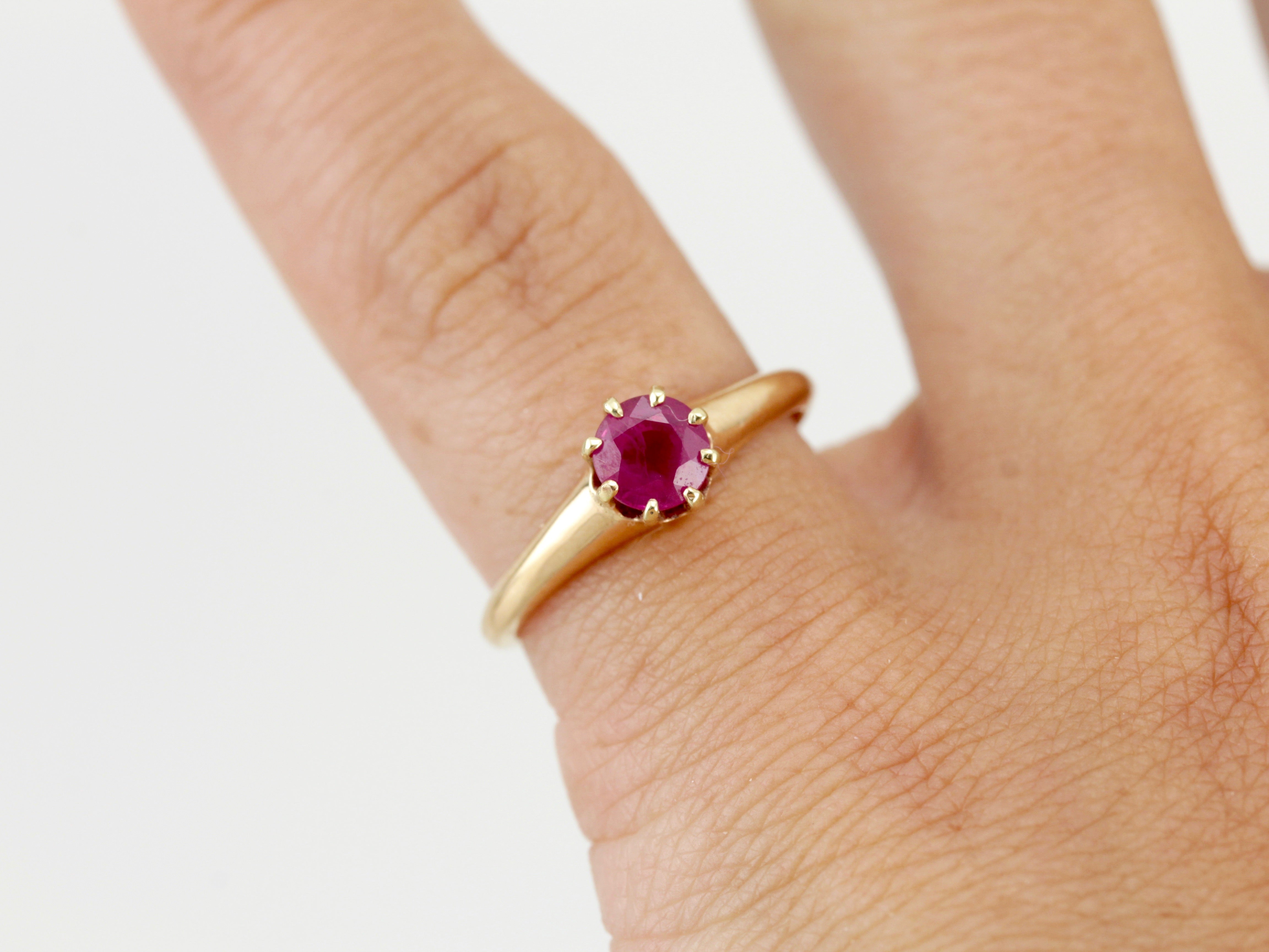 The original solitaire engagement ring, this was crafted in the late 1800's and likely set with a diamond or sapphire. We've added a brilliant, round cut Pink Sapphire with wonderful depth of color, and bright flashes of hot pink. This was meant to be an engagement ring, and is well suited to the job; but one shouldn't be afraid to wear it as an everyday ring, or a stacked with other rings! The simple style lends itself to a variety of ways to wear it, with the centerpiece always remaining the brilliant pinky-red stone!