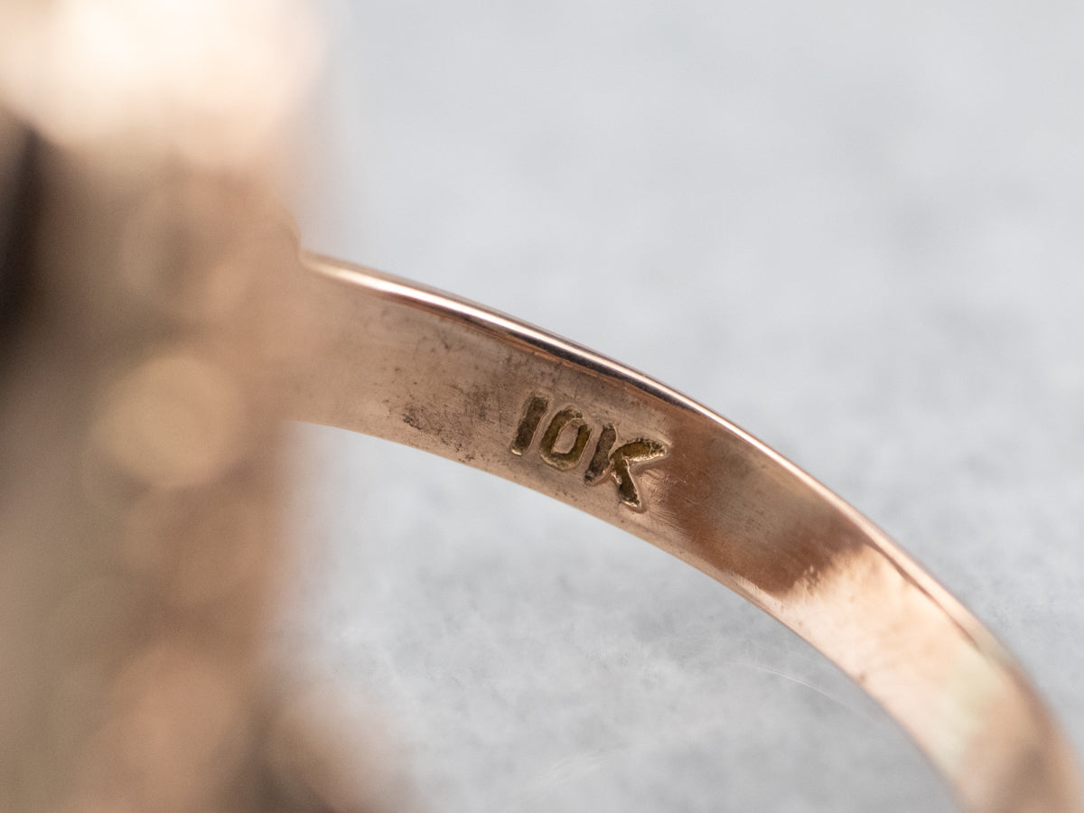 This symbol, Greek letters carved into banded black and white onyx! We suspect that this is related to a sorority and it most certainly dates to the Victorian era. Crafted of antique 10 karat rose gold, this textured mounting features flower blossoms and scrolling motifs around its bezel frame, a perfect gift for the sorority sister in your life!