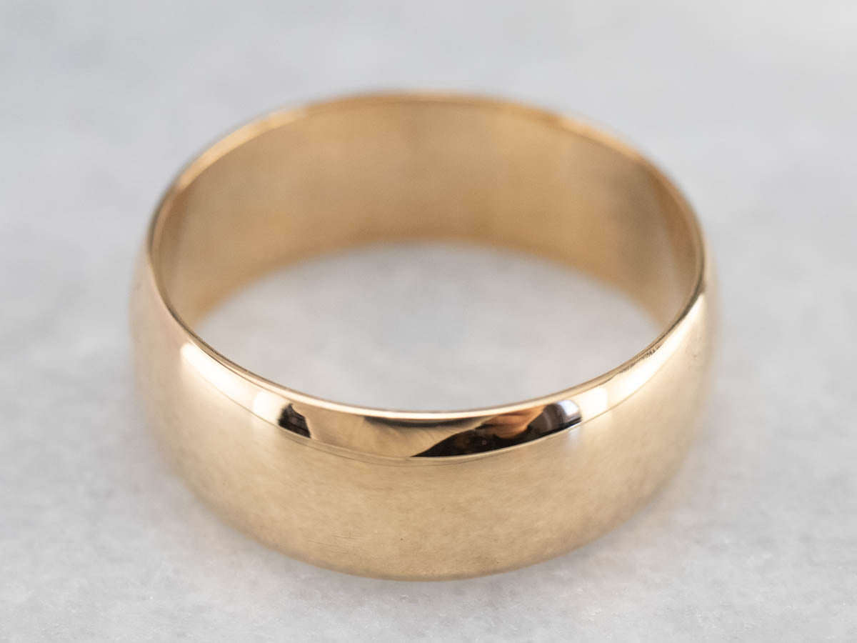 This simple wedding band is made special due to the quality of the metal! Crafted of 18 karat gold, this ring has a rich hue and fantastic polish that feels luxurious. The generous width and subtle dome make this band perfect for larger hands.