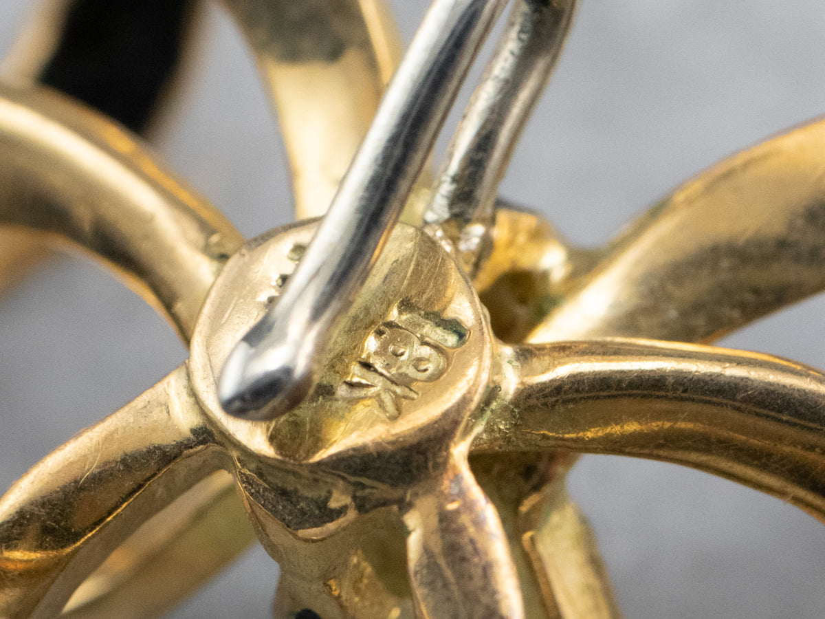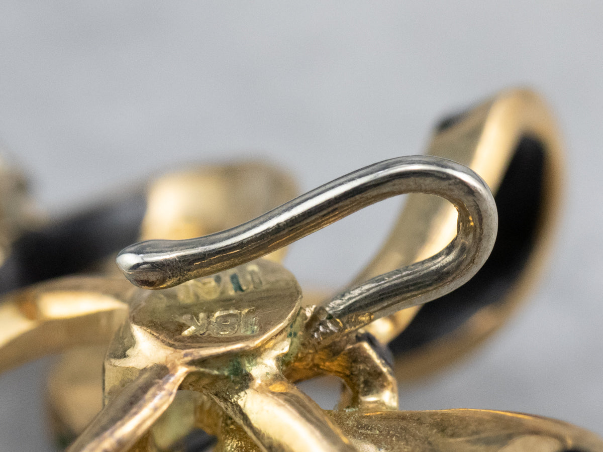 This Retro brooch looks like ribbon tied into a bow! The black enamel is crisp and in excellent condition, beautifully accented by 18 karat gold floral inlay. This piece has a loop at the base that was originally designed to hold a small watch, but could easily hold a charm or pendant.