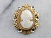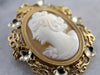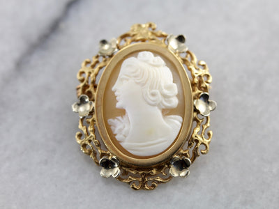 This cameo is stunning! Crafted of 18K gold, this piece features a scrolling motif framework decorated with bright white gold flowers. The portrait of the lady is fun and charming, she has a Gibson Girl style hairdo and rolling curves. This piece dates to the 1940s or so. This is crafted of tan shell with hints of yellow, carved with great detail and delicacy in a pretty portrait.
