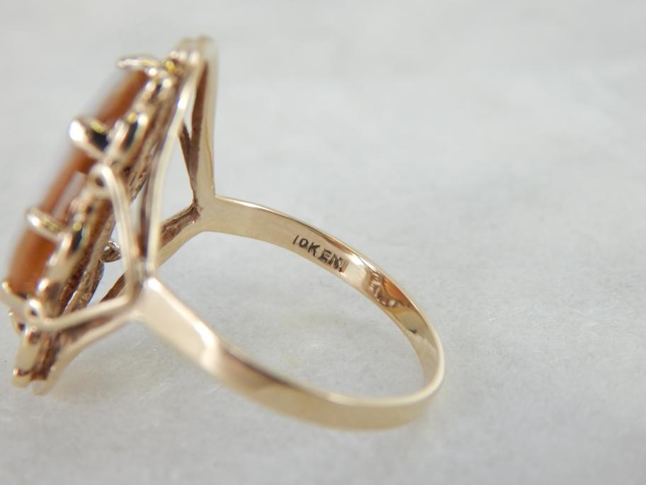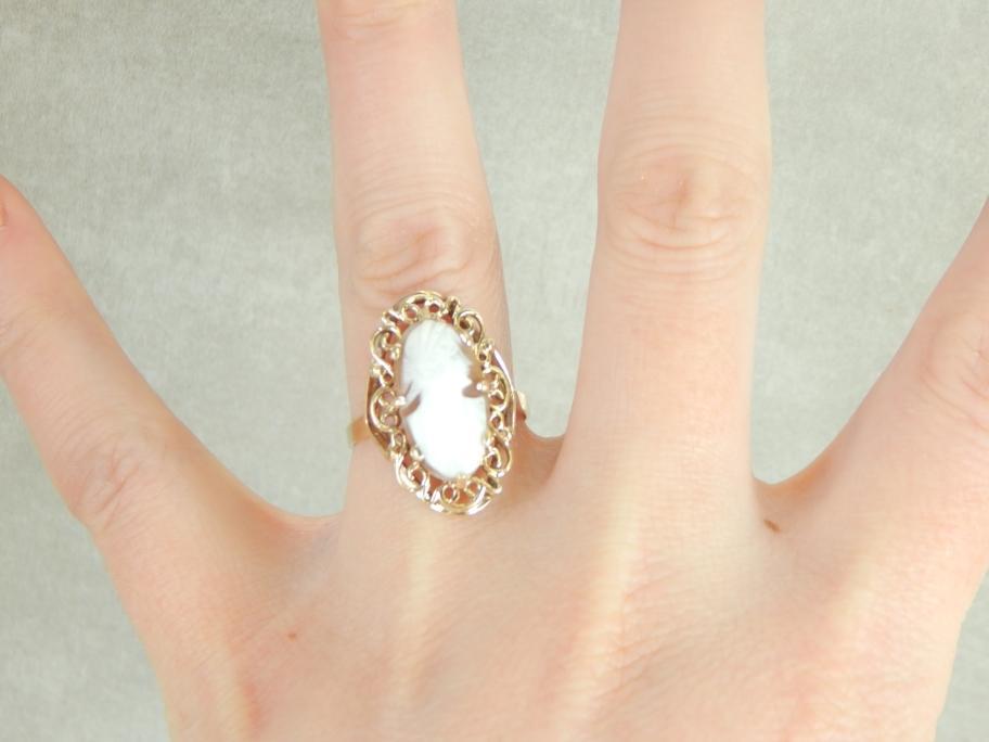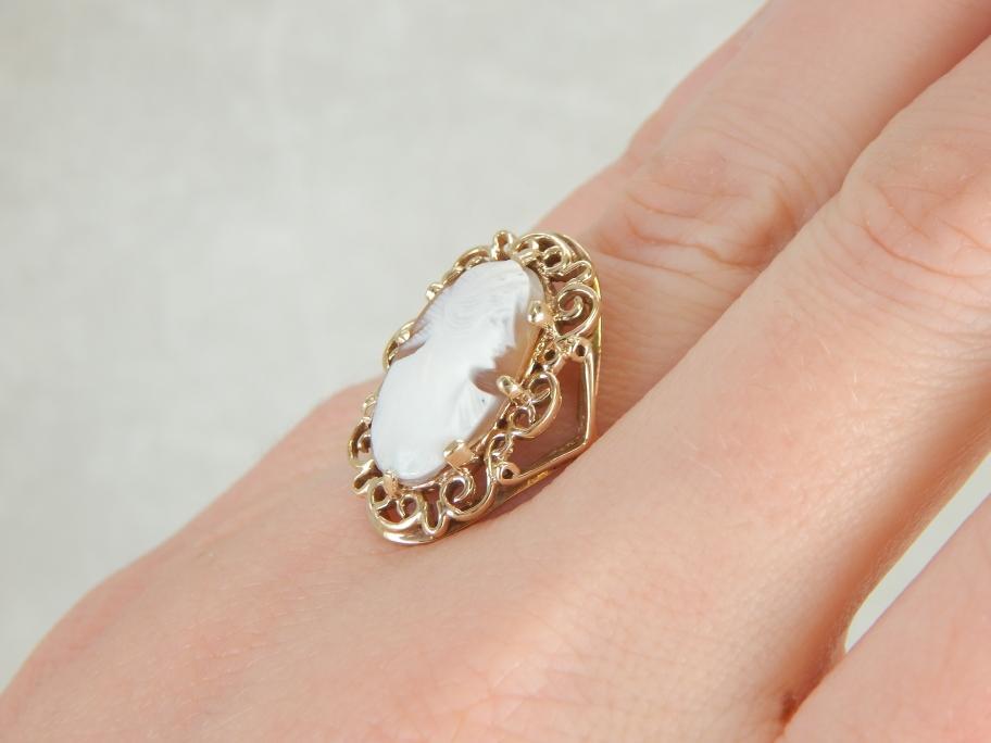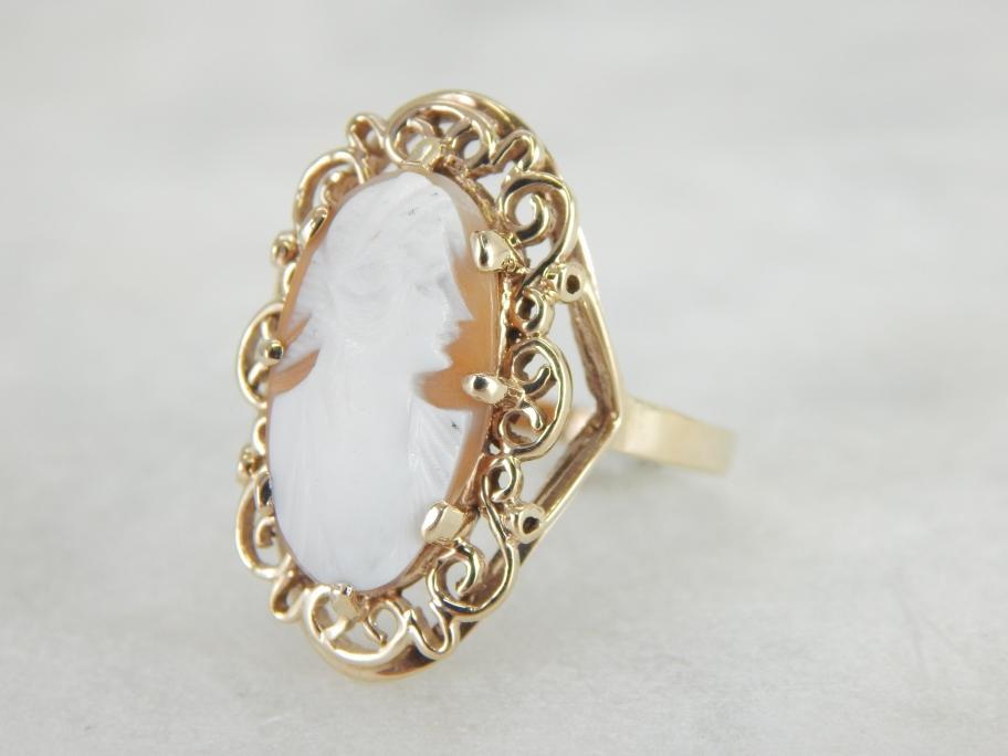 This vintage ladies ring features the well carved profile of a matron of Ancient Rome. The shell is deep, rich brown and the portrait is a clean white. Yellow gold filigree provides the perfect frame for this feminine cabochon.