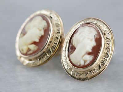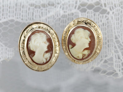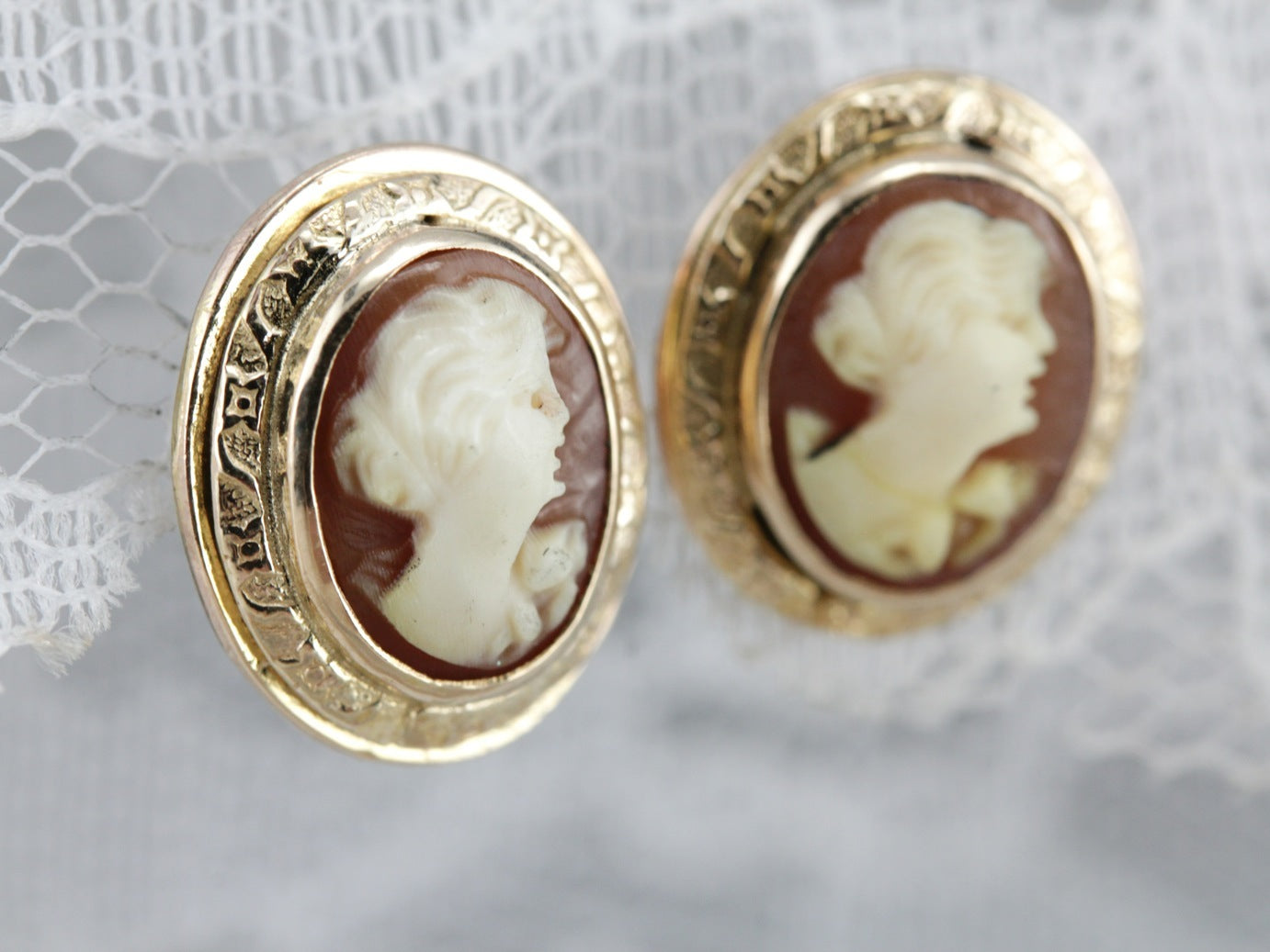 Accented with a textured gold frame, these Mid-Century earrings are demure, with just a bit of sass! The carving is exquisite, the colors of the natural shell are perfect, and the mountings are simple and subtle, yet rich, with a very secure screw post backing.
