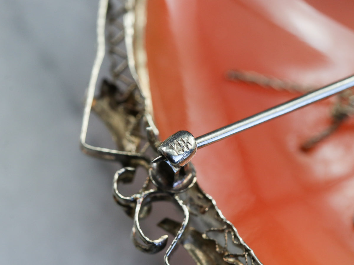 The frame of this vintage piece is gold filigree with a wonderful, shining patina. The bright color and adorned style are the perfect compliments for this large cameo! Carved from a warm apricot hued conch shell, this lady is beautifully and classically portrayed. A white gold necklace around her throat is set with a shining diamond.
