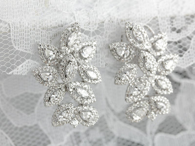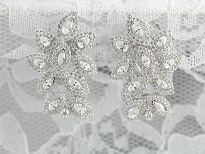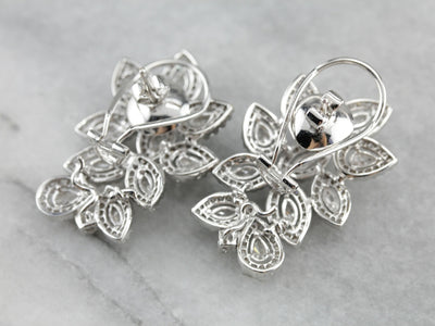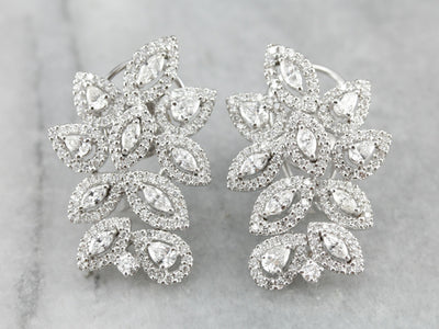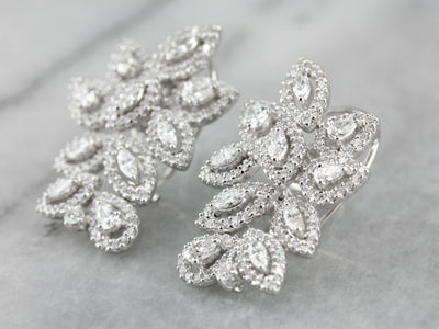 These vintage cocktail earrings are beautifully crafted, substantial and luxurious in style! Bright white gold forms a gleaming frame for the outstanding diamonds that form a glittering motif, sure to be an heirloom piece for years to come!