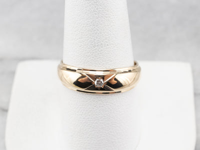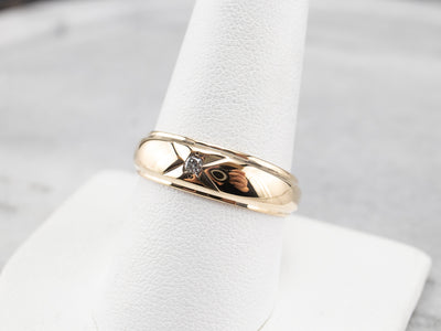 This simple vintage piece features a simple etched design, set with a little glittering diamond. The bright polish of the gold gives this piece a classic coloring, and the domed shape gives the very flat ring just the right amount of height!