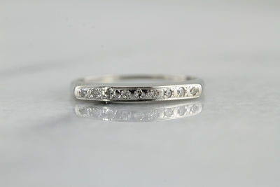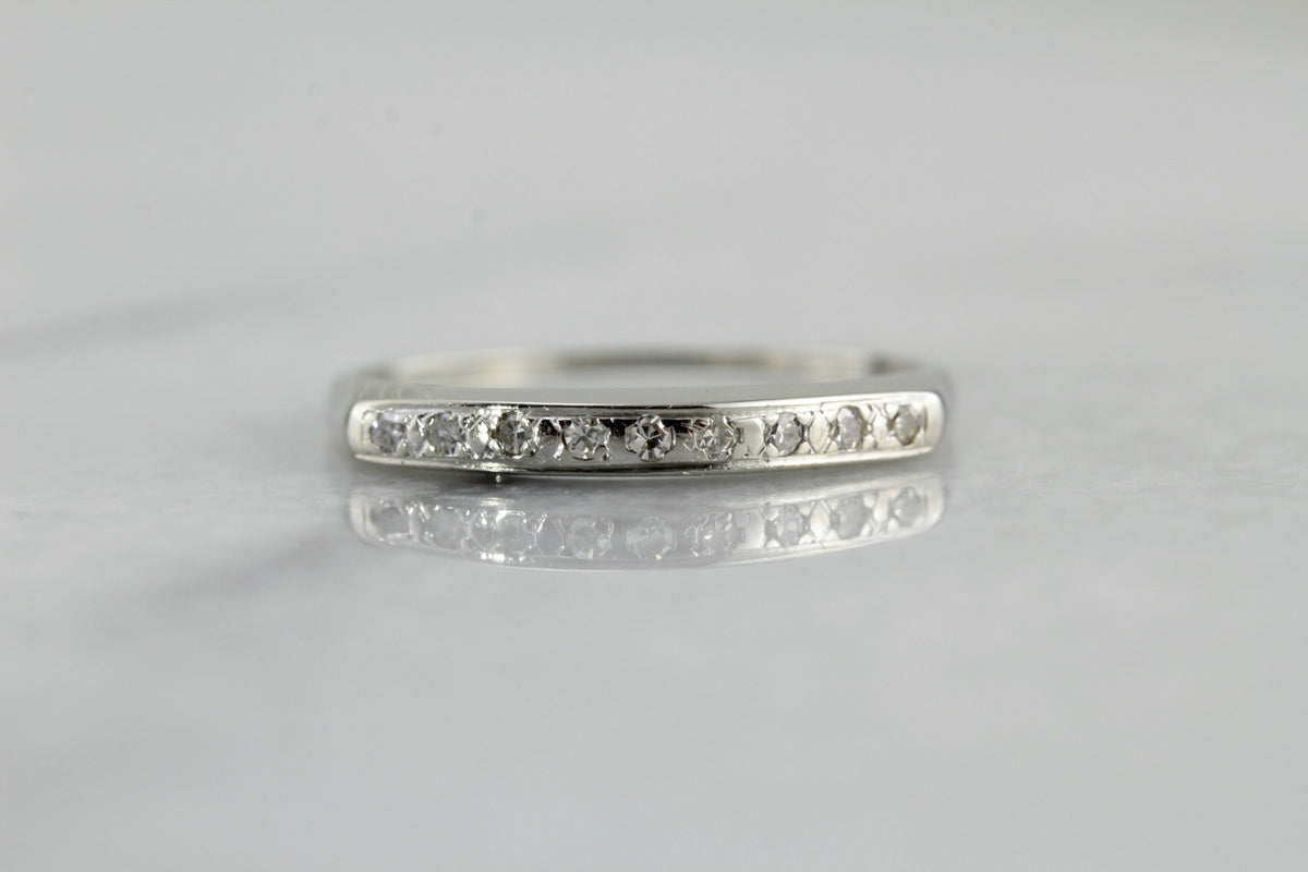 Easy to wear alone or pair with an engagement ring, this vintage, white gold wedding band creates a wonderful profile no the hand! The diamonds are of exceptional quality, pretty gems that are securely inlaid directly into the white gold, providing security even if the ring is worn daily!