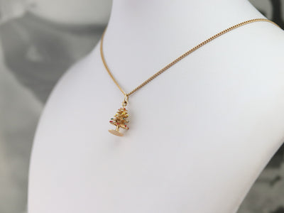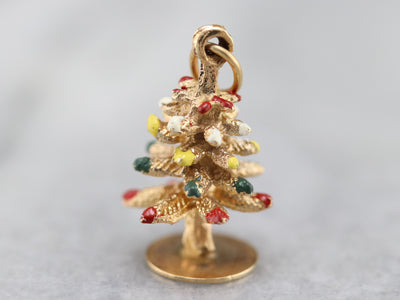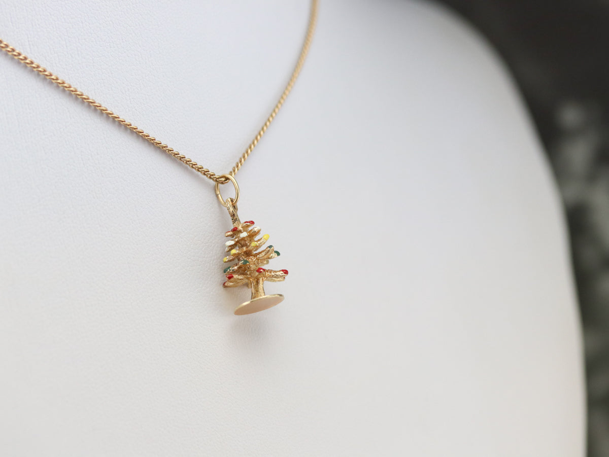 Solid gold with sweet textured branches, this piece has been adorned with different colored enameled dots for ornaments. This vintage charm stands on its own, so besides being a great pendant or charm, it can be displayed in a case year round!