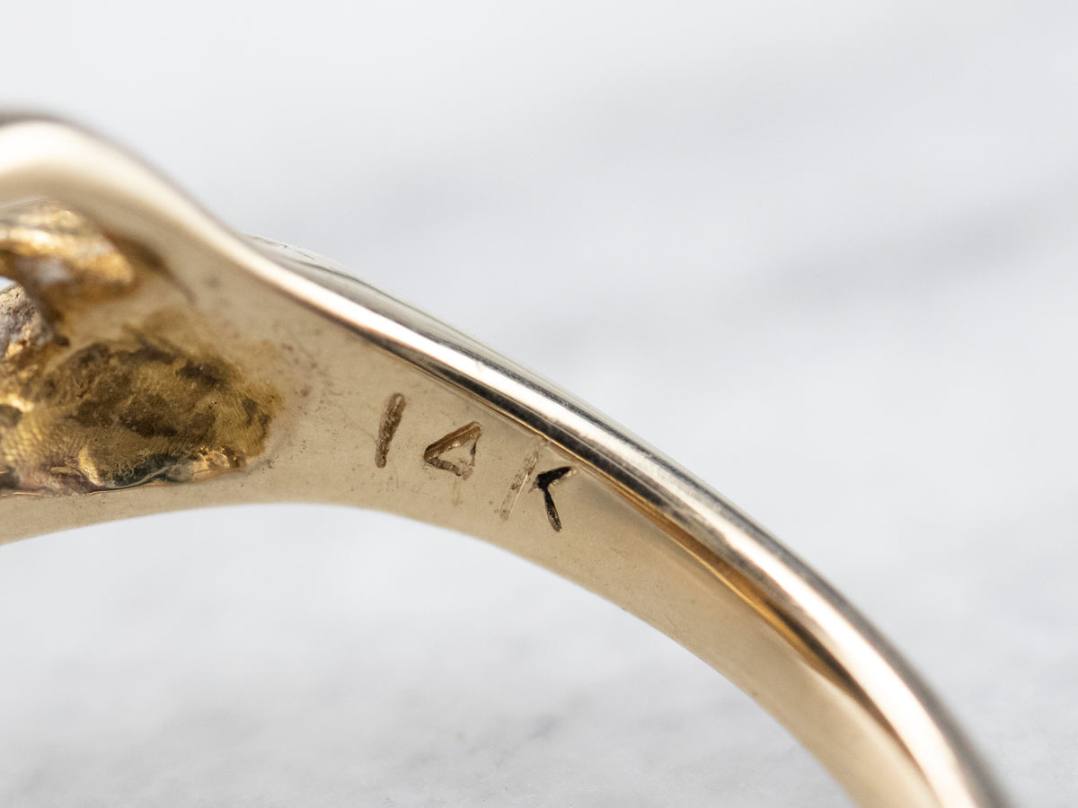 This lovely floral ring is crafted of yellow gold, a sturdy and affordable choice that's perfect for everyday wear. The center is a smooth, polished oval of onyx, a classic stone for ladies' wear - black does go with everything, after all!