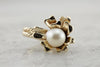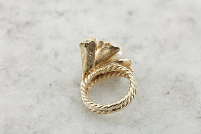 This fun ring has the look of a bouquet of flowers, or perhaps a textured cornucopia set on a table of golden ropes. A beautiful piece, this is currently sized to be worn as a bold, statement pinky ring! A creamy, soft white pearl sits at the center, framed in the stylized flower.