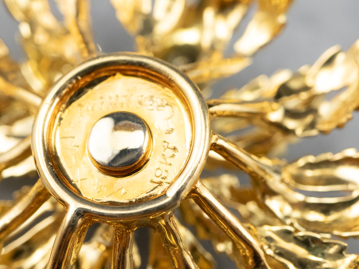 This is an exceptional piece of jewelry, comprised of the finest possible materials. Finely crafted at the turn of the century, this hefty, weighty yellow gold pin features exquisite texturing and polish in a blooming floral motif. The centerpiece is crafted of white gold and set with bright diamonds, adding a little bit of glitter to this incredible pin.