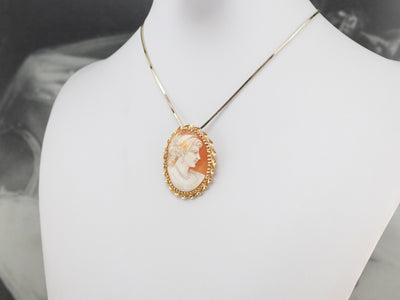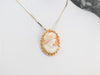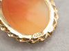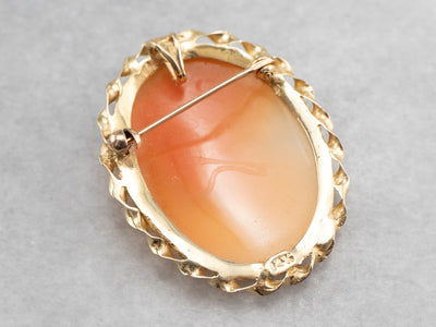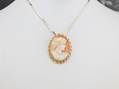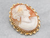 Versatile and lovely, this pin or pendant is beautifully crafted of yellow gold. The framework is a simple twist of polished metal, and the size of this piece lends itself well to wearing day to day as a signature cameo. The color of the shell is a rich, warm tan, and the carved cameo portion is creamy with hints of coral.