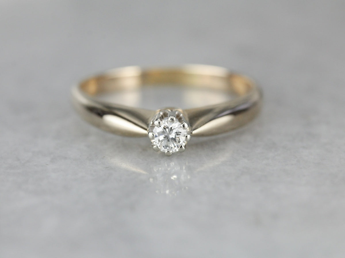 This is a slight twist on a classic design! The shoulders of the ring taper to the center, reflecting light and drawing the eye to the diamond, which is bright and full of sparkle. The high profile allows this ring to be worn with others while still standing out!