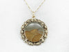 Brilliant shades of coffee, russet and grey shine from the center of this pretty jasper gemstone pendant creating desert landscape effect. The antique, Art Nouveau frame in detailed green gold is a perfect accent for this chocolate and mocha shaded stone.