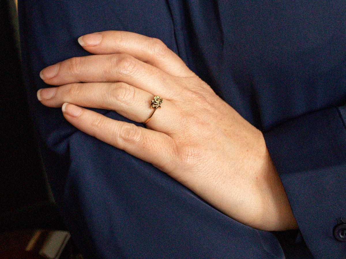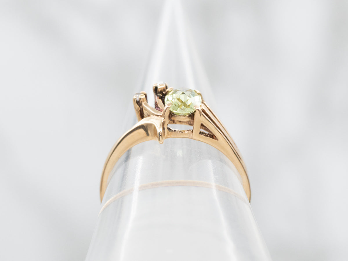 We've set this vintage rose gold setting with mali garnet, an earthy gemstone, with a new leaf green color. The four-prong setting allows lots of light in and highlights the fire in this gemstone! This mali garnet is the perfect complement to the unique design of this vintage diamond setting.