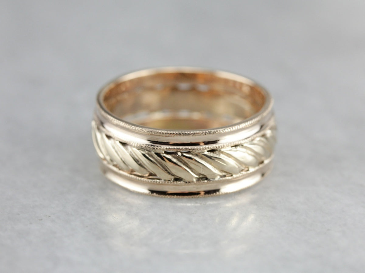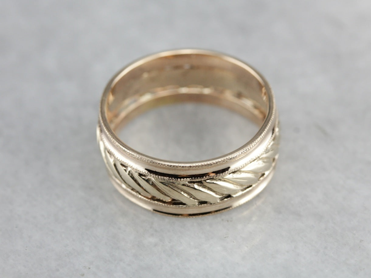 This vintage wedding band is a little treasure! Wide enough to wear comfortably alone, this handsome ring is etched in the center with a simple linear motif, milgrain details on the edges complete this timeless band.