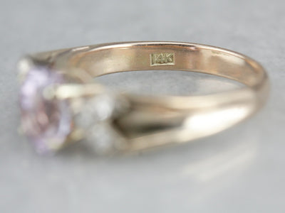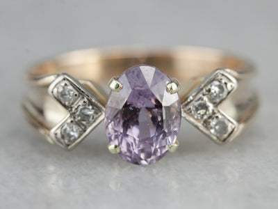 We love the refined style of this vintage engagement ring. The tapered, chevron-shaped shoulders are interesting, and the piece has an excellent balance. The center stone is a lovely lilac color, with hints of violet and sky blue. Both enhanced and protected by the white gold frame, this gem would make a lovely engagement piece!