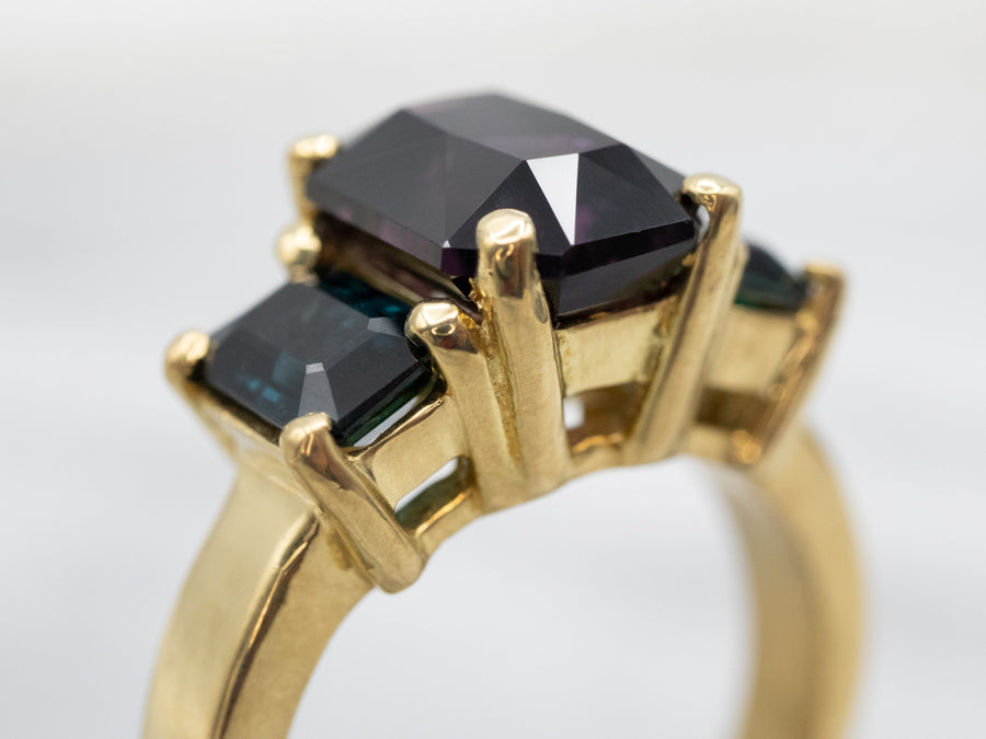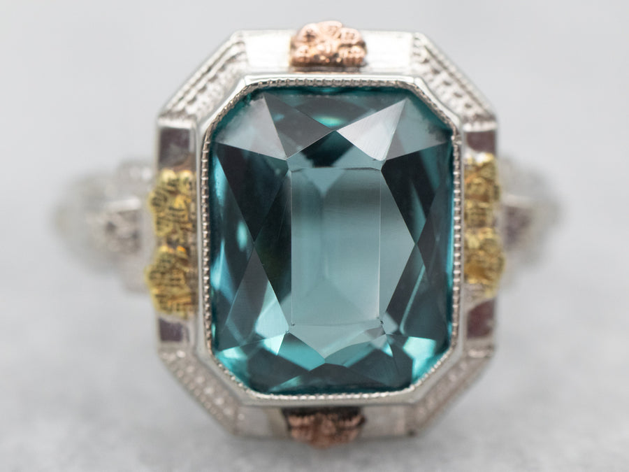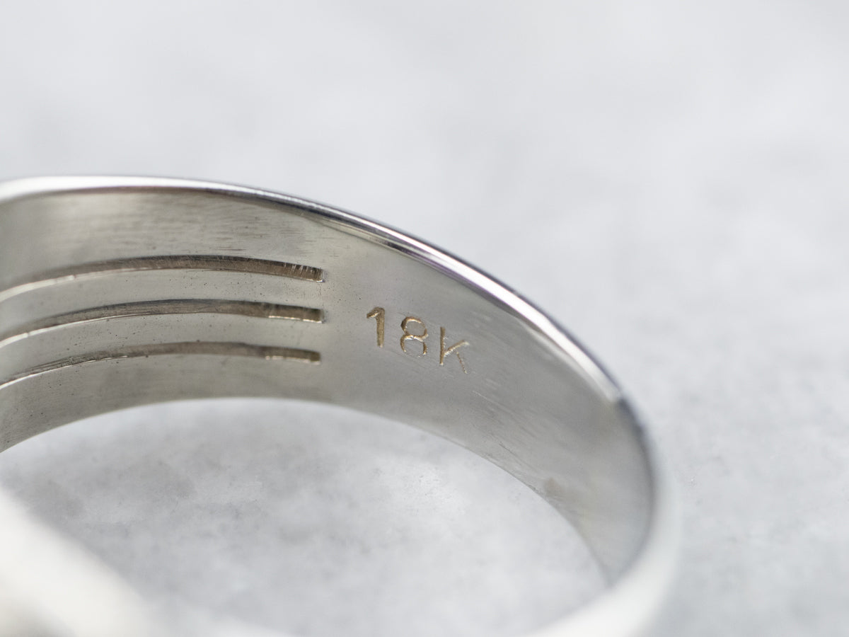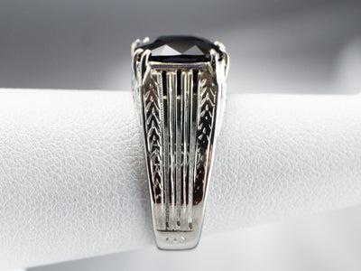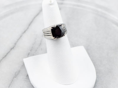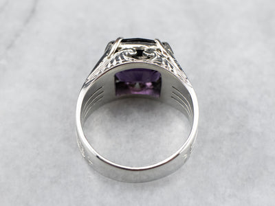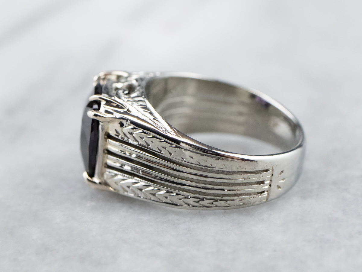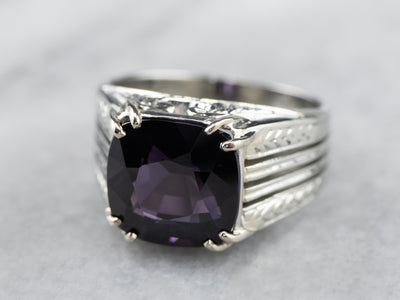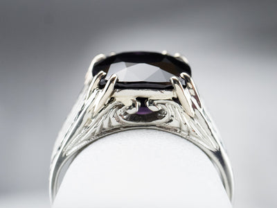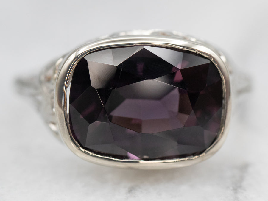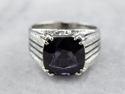 We've set a unique gemstone called spinel into this stately Art Deco ring! This deep purple stone has a romantic mystery to it with its dark hued beauty. Classic wheat patterns stretch down the band and accent the pierced design for an impressively ornate look.