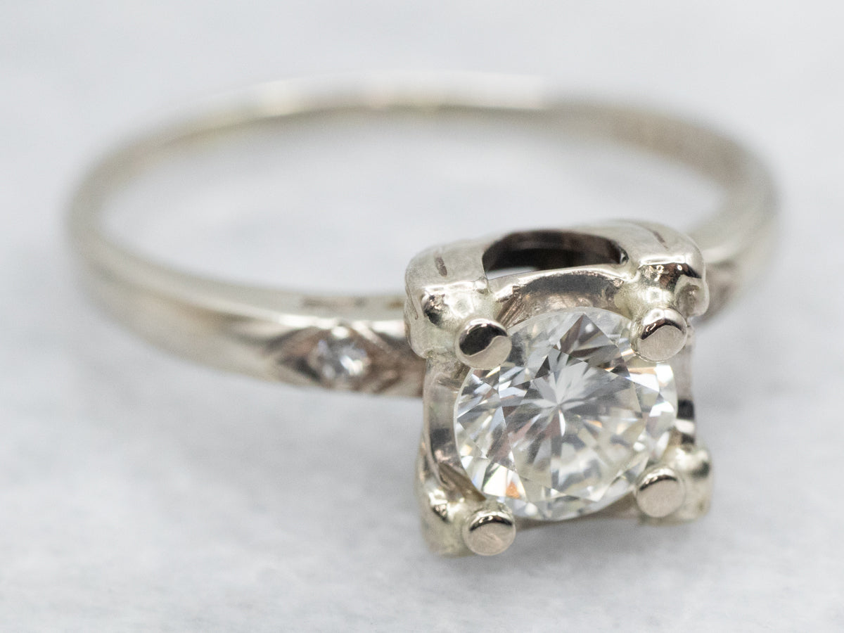 Metal: 14K White Gold Gem: Diamond .70 Carats, K in Color, I2 in Clarity Gem Measurements: 5.6 mm, Round Accents: 2 Diamonds totaling .02 Carats, G in Color, VS in Clarity Ring Size: 6.50 Marks: "FEATURELOCK 14KPAT-D" Stamped on the inside band
