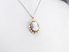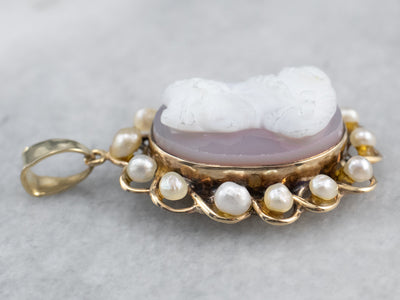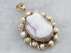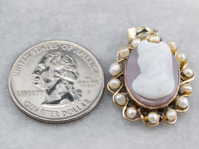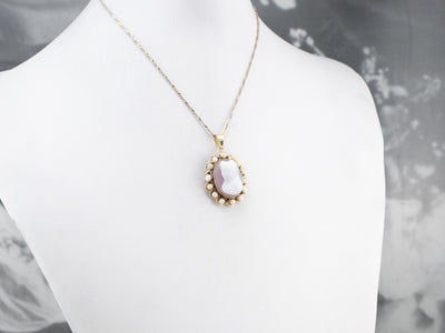 This gorgeous vintage cameo pendant was designed in the Victorian Revival style! Carved in mauve colored sardonyx, the cameo depicts a stately woman in 1800's dress, her image framed in a halo of pearls. This pendant would make a lovely gift to a bride!