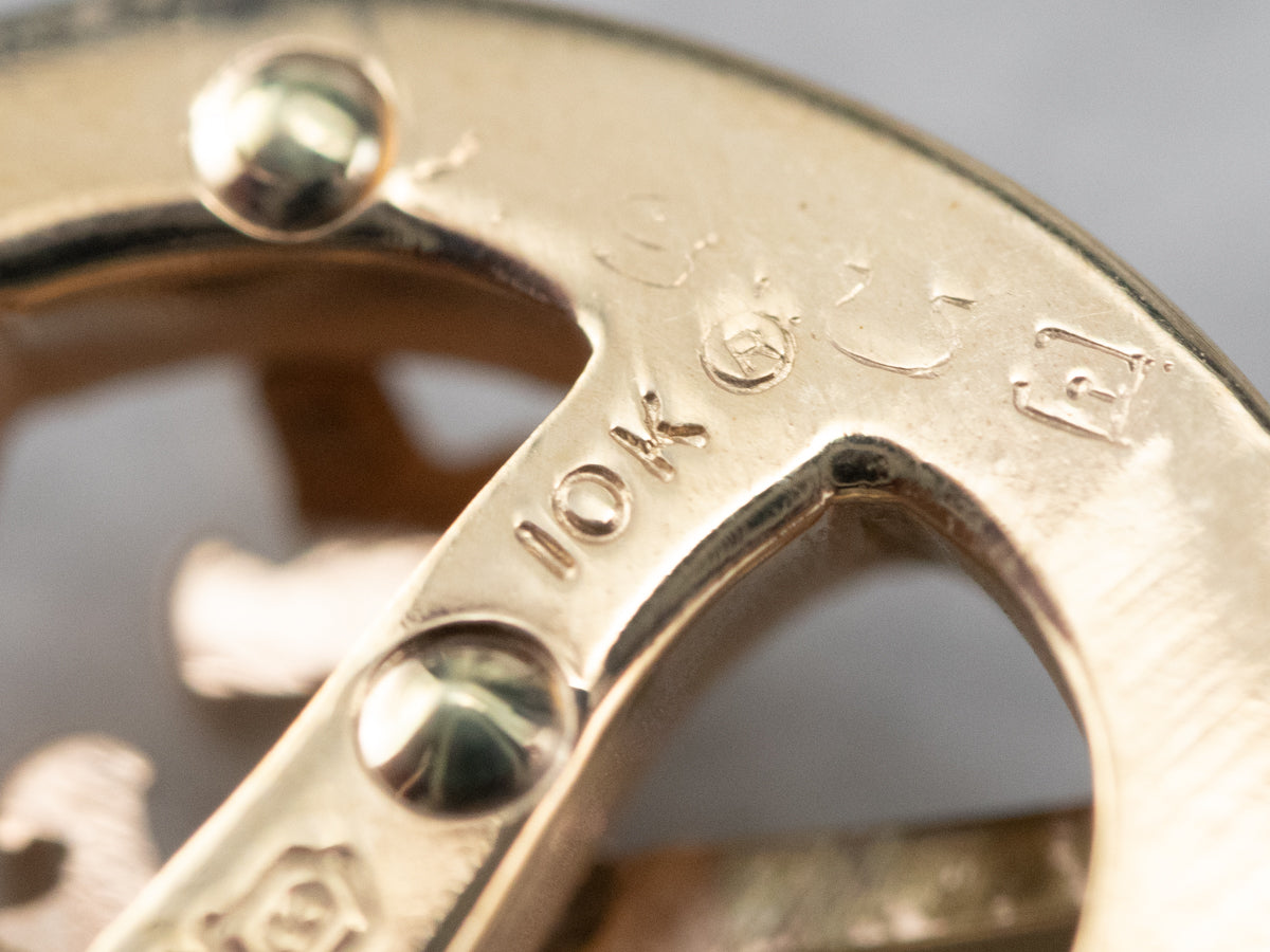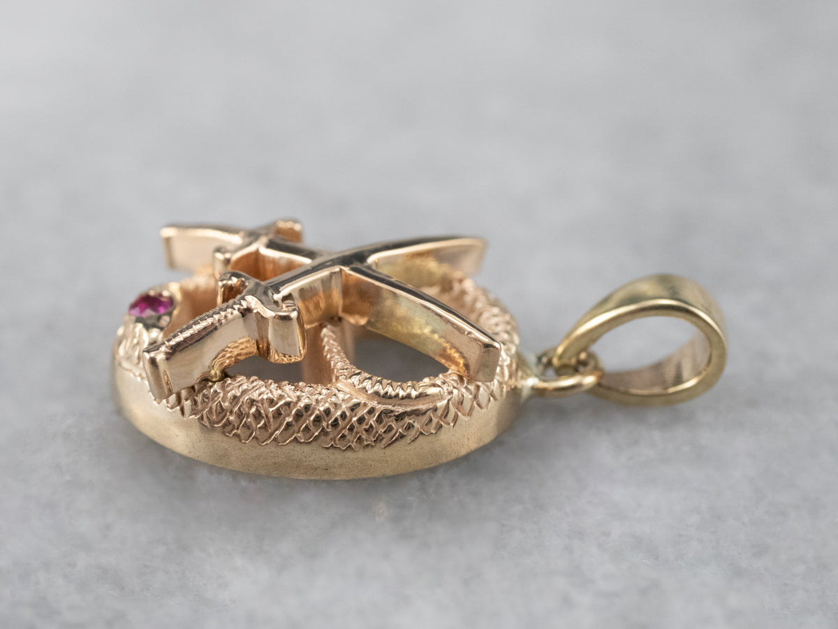 This symbol, of two crossed swords, atop of a coiled ruby-eyed snake in this vintage gold pendant! This piece is the symbol for the Theta Chi fraternity founded at Norwich University in the 1800s, the organization's coat of arms goes as follows: "Or, on a bend gules, a nowed serpent between two swords, points downwards, palewise all the first", in wonderful condition this vintage piece is ready to wear or gift!