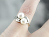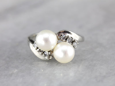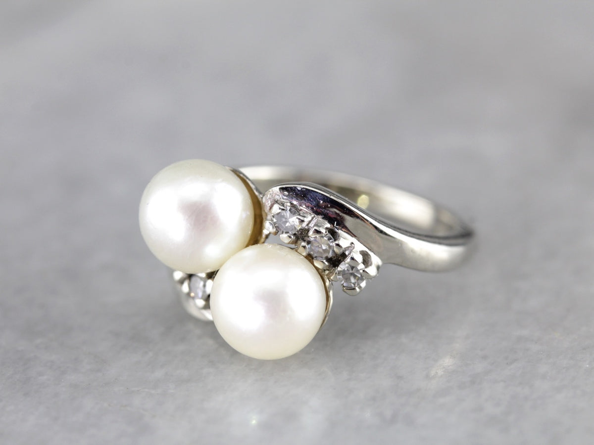 Bright white gold stretches these pearls apart, creating a little bit of space between them, and a wider profile across the finger as well. Small diamonds bring some sparkle to the centerpiece!