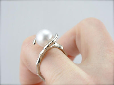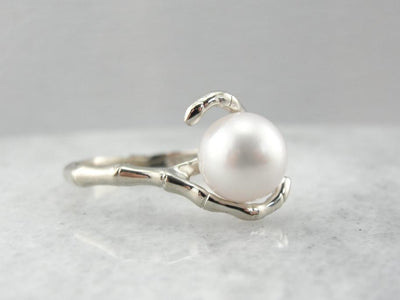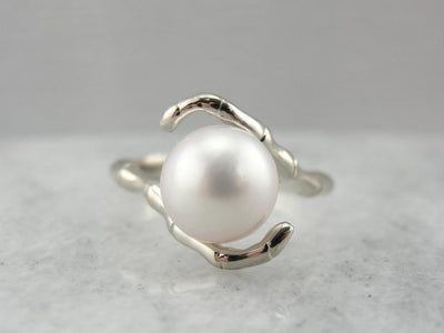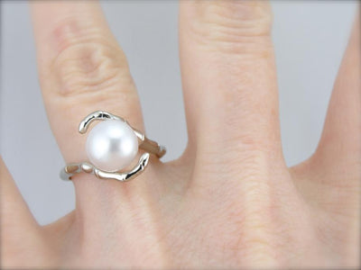 This beautiful, bypass designed white gold ring is an amazing and feminine statement ring! The luscious pearl is cultured, with lovely iridescence. This would make a perfect piece as a right hand ring on a Wedding Day - something that could be worn over and over for years to come.