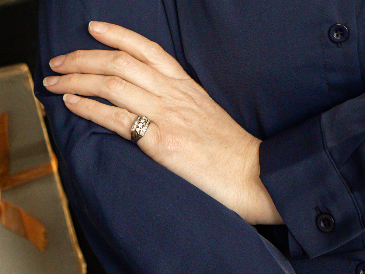 This piece is both subtle and sophisticated. Crafted in the 1940s or 50s, the center row of diamonds sits up off the ring, held by interesting, structural prongs. The outer rows are pave-set with bright, glittering diamonds. The undercarriage of the ring is pierced, letting in plenty of light to set off the stones!