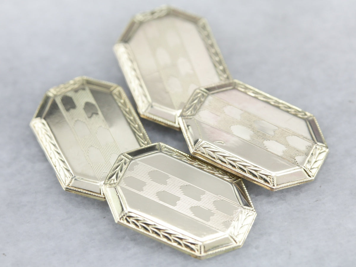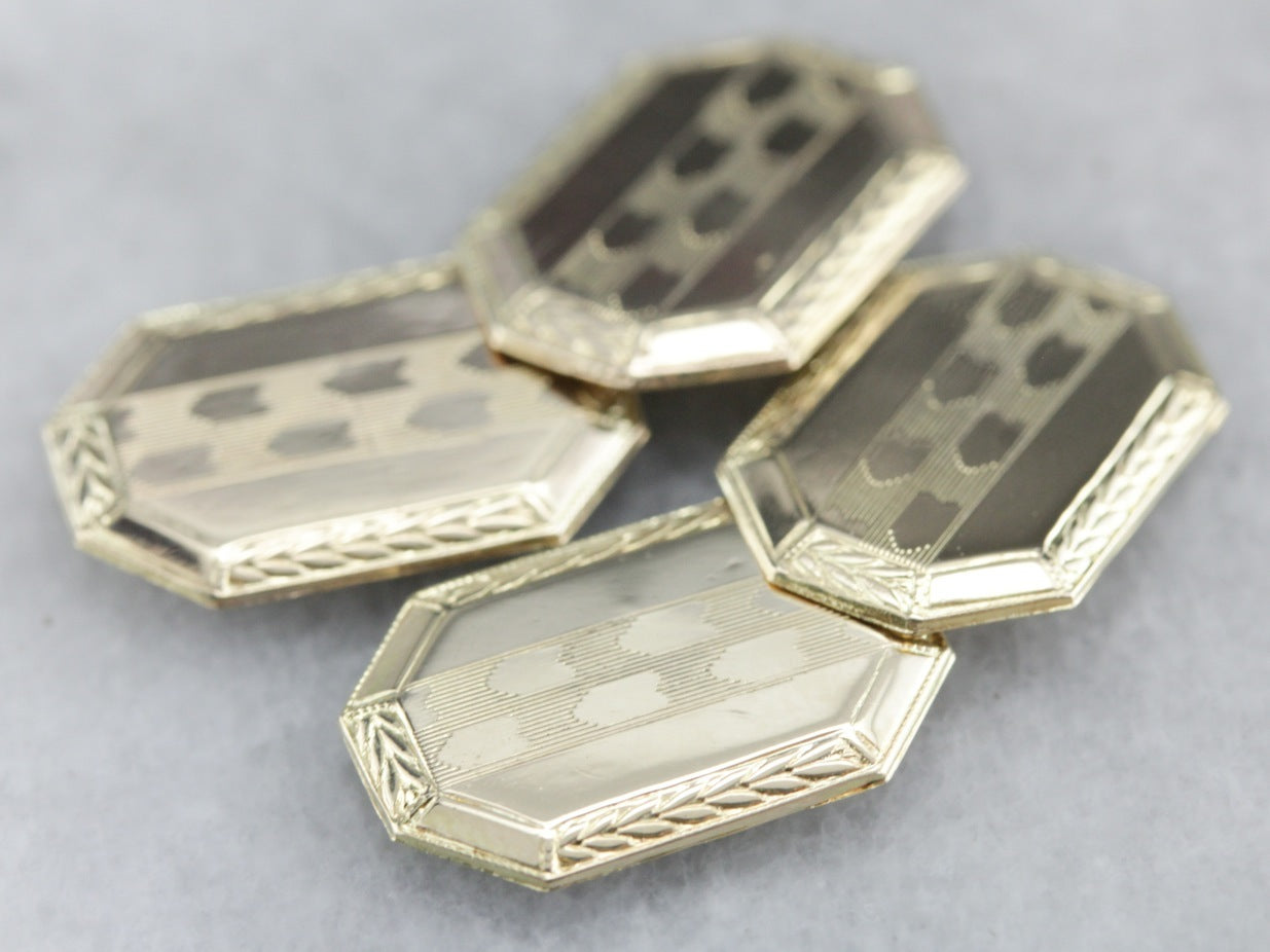 These antique cufflinks are handsome and yet artistic, with pinstriped details and stylized chevron patterns engraved in the polished yellow gold.