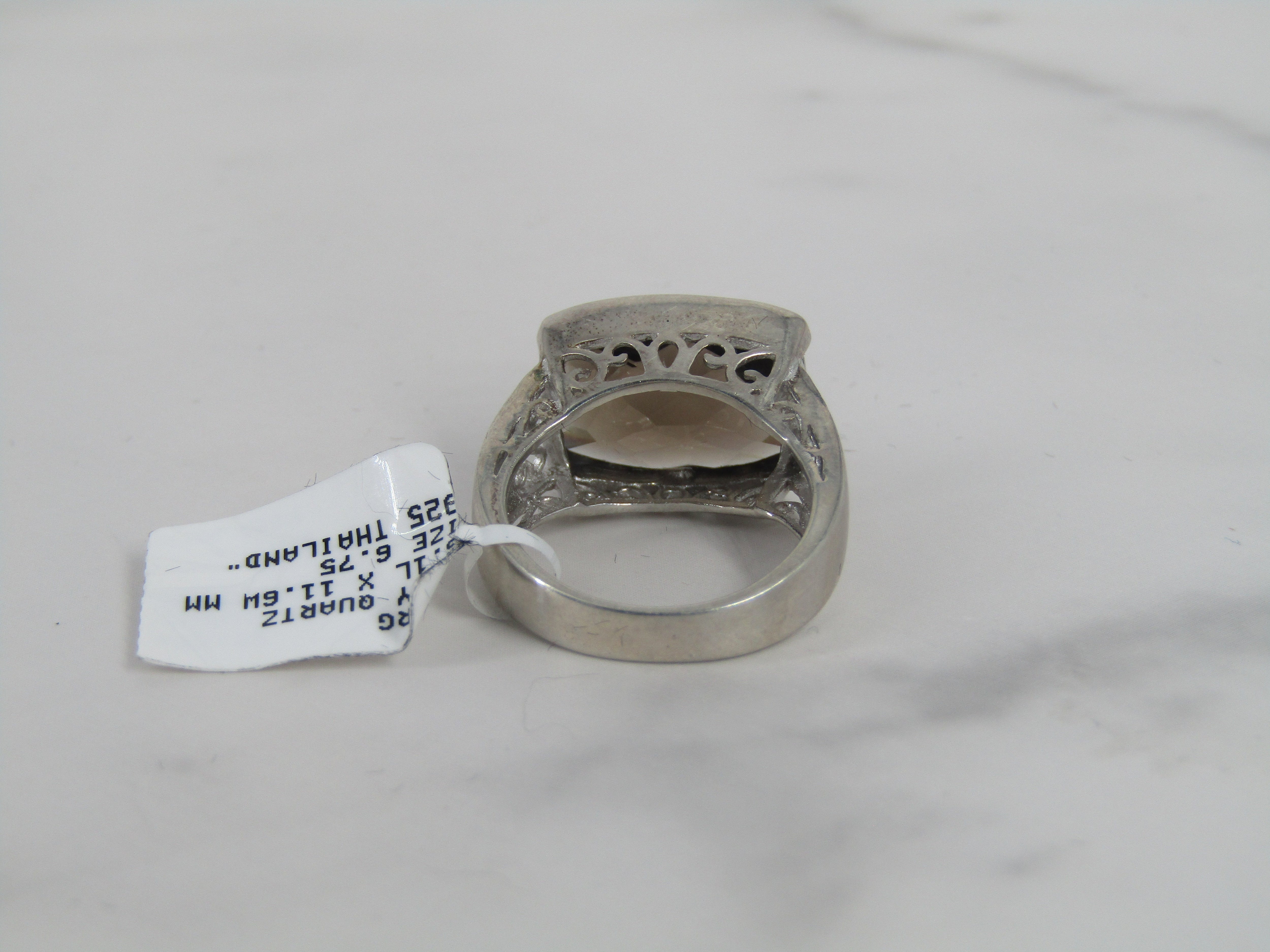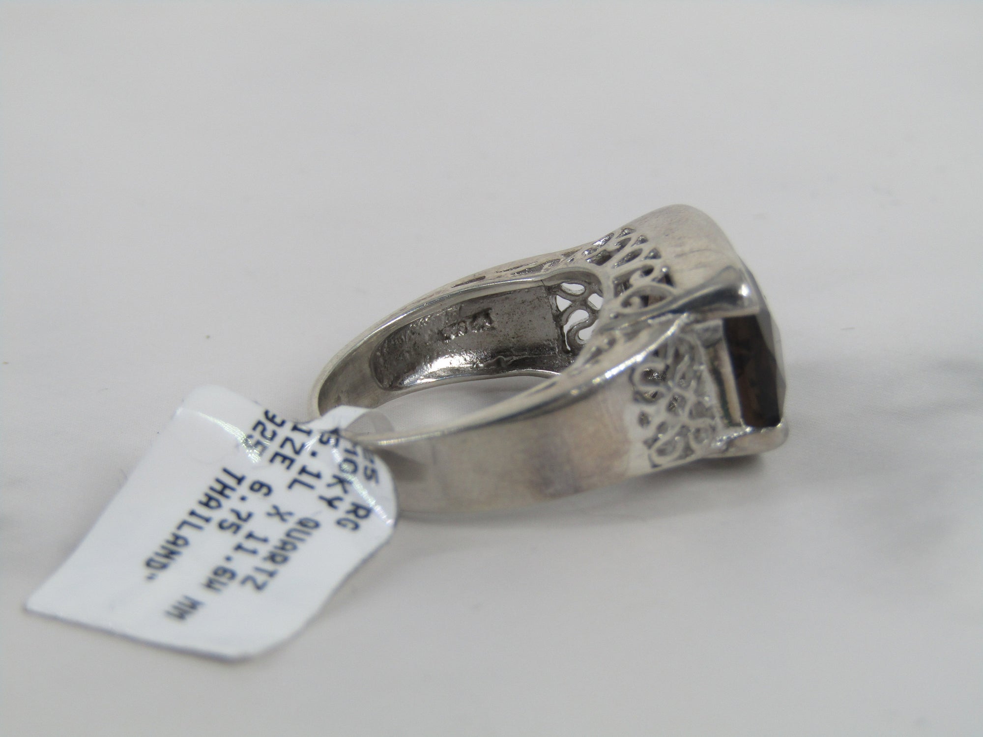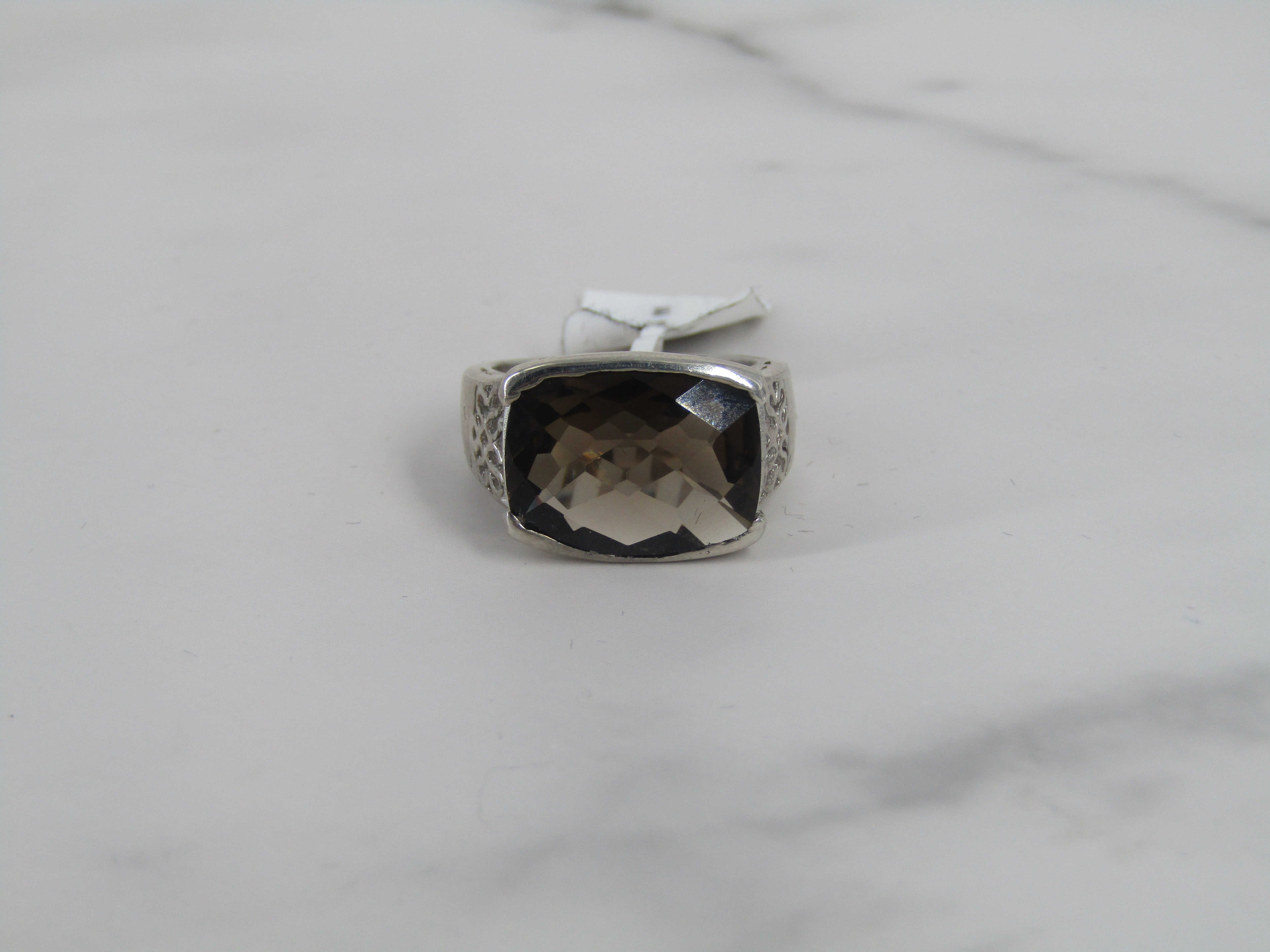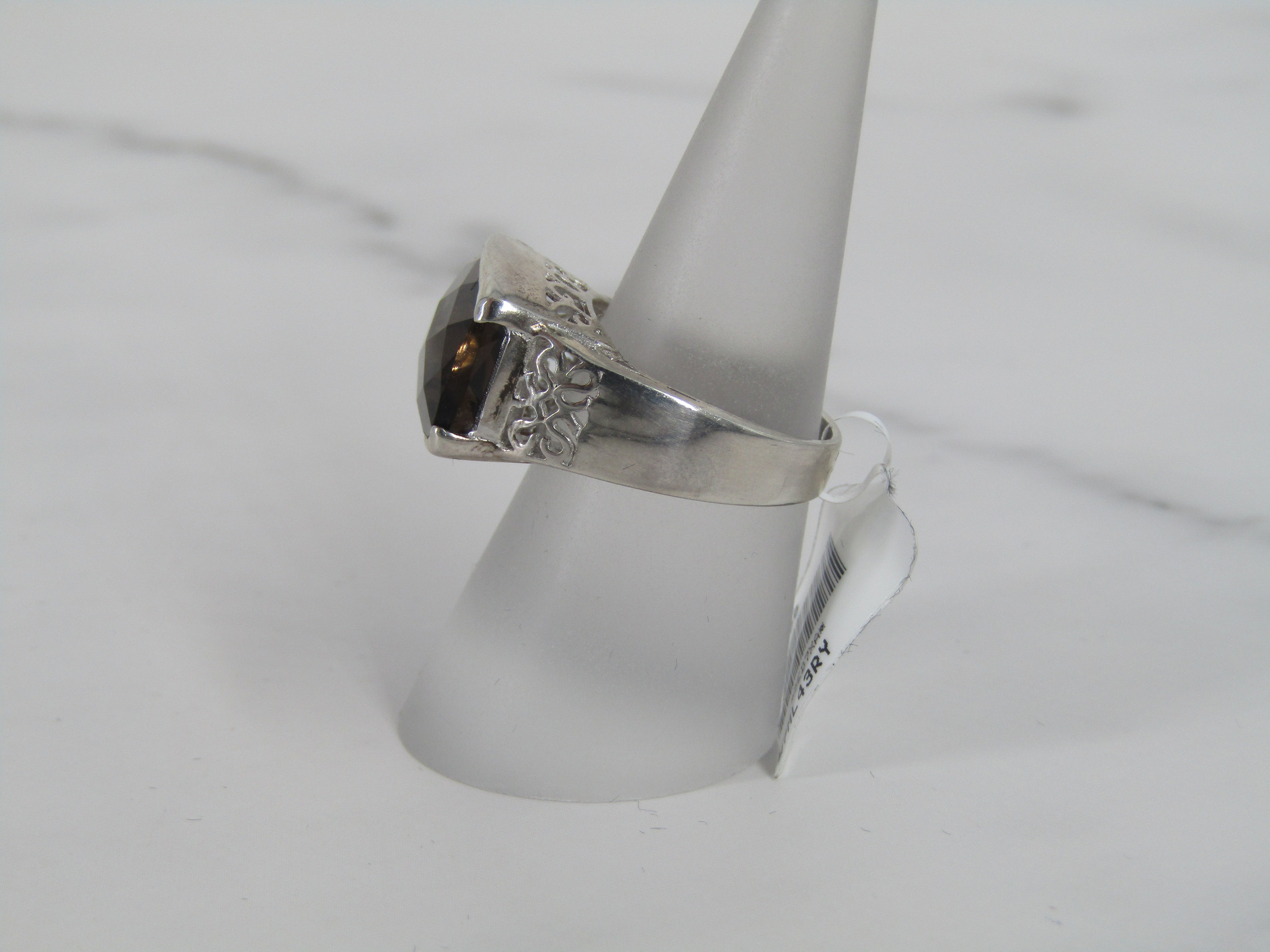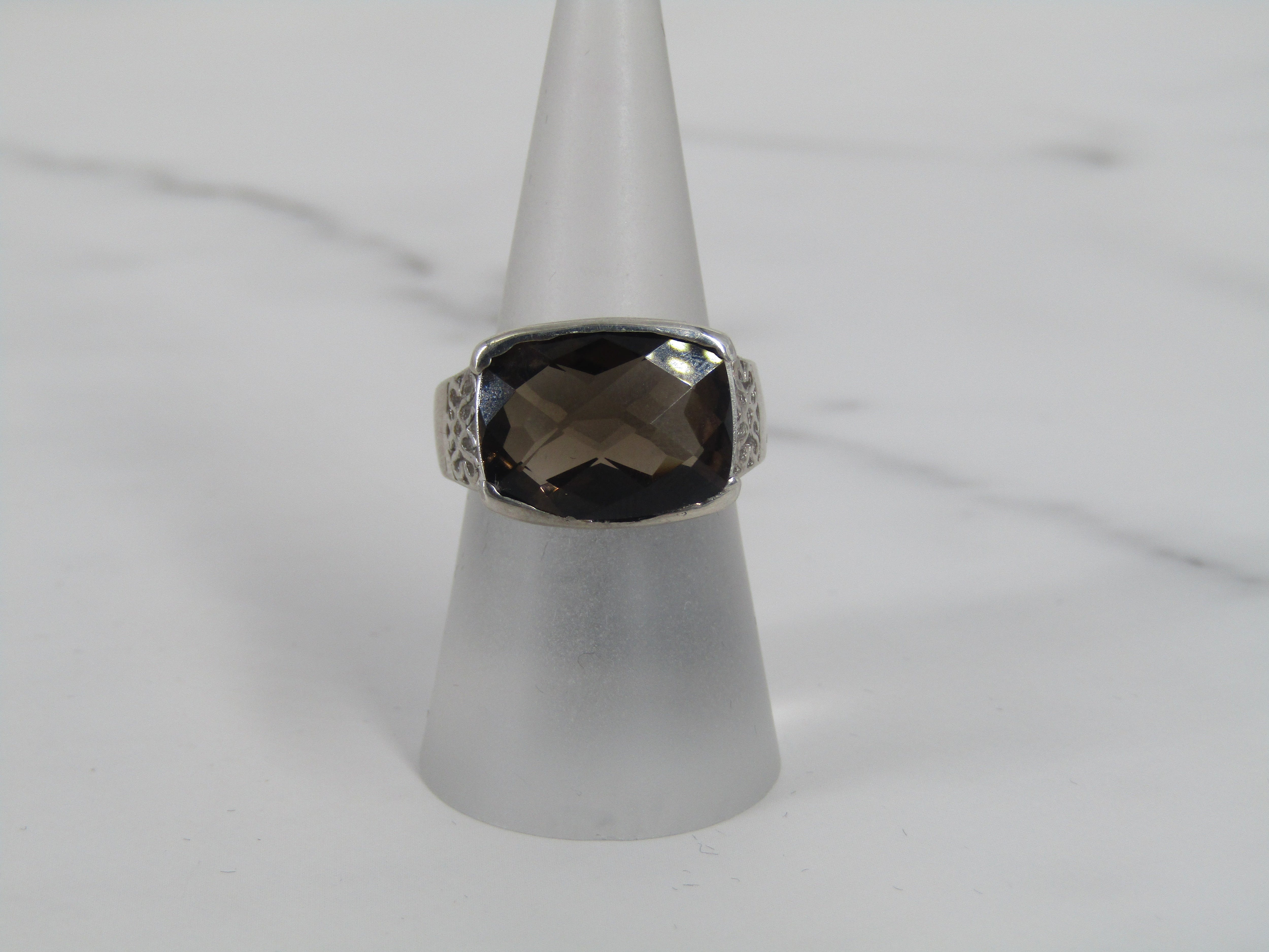Sterling Silver ring with open work, filigree design shoulder and faceted, smoky quartz rectangle center.