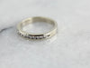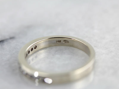 Lovely White Gold, with it's shining white polish, is paired with fine, bright diamonds in this vintage wedding band. Easy to wear, the band has comfort shaping on the inside and sits low to the hand.