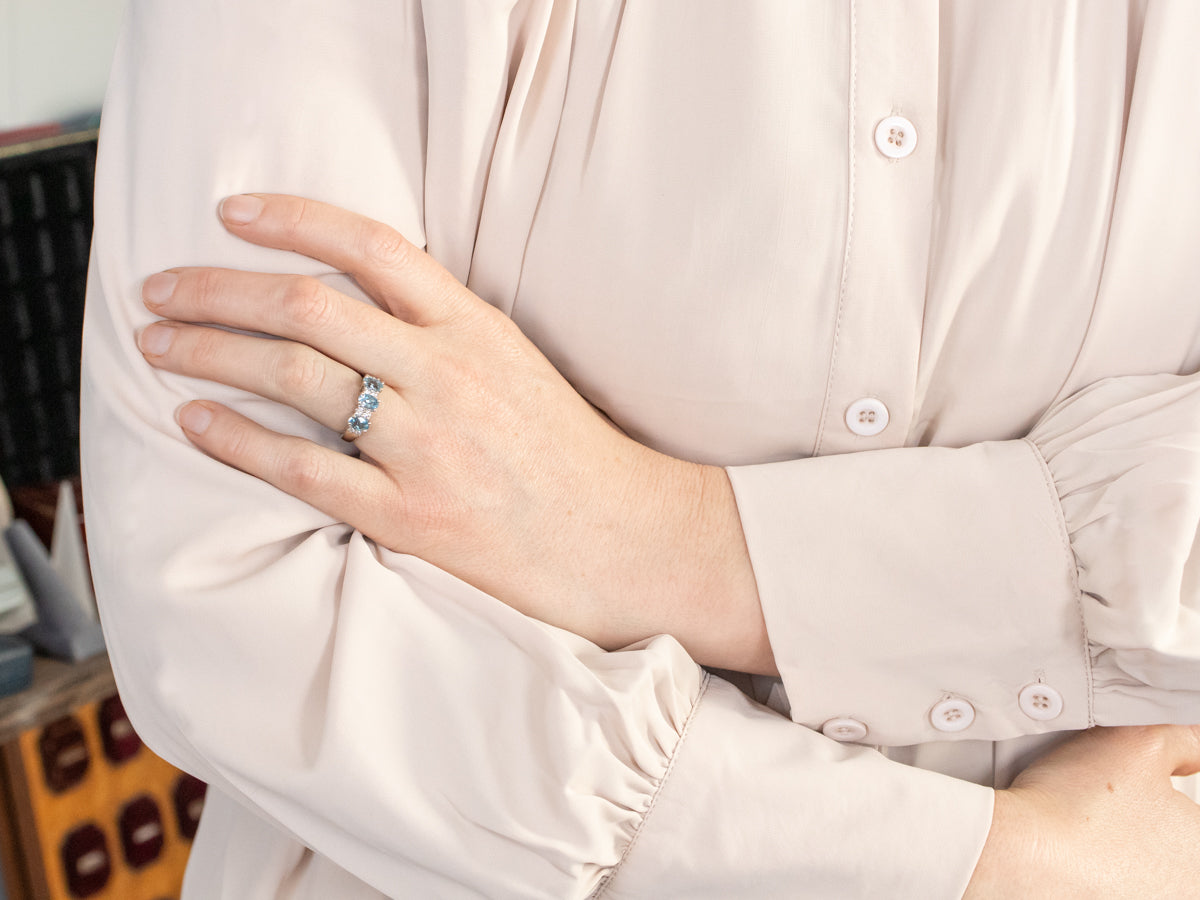 This aquamarine ring is fresh and feminine! The aquamarine is a crisp, clear sky blue, full of light and sparkle. The glittering diamonds perfectly complement the aquamarine, forming an attractive silhouette on the hand.