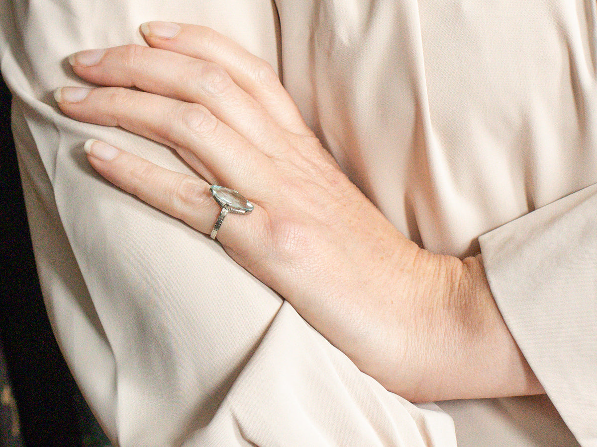 Experience the timeless elegance of this solitaire ring. Made with white gold and featuring a stunning marquise cut aquamarine, this ring is sure to make a statement. Perfect for those looking for a classic yet unique piece of jewelry!
