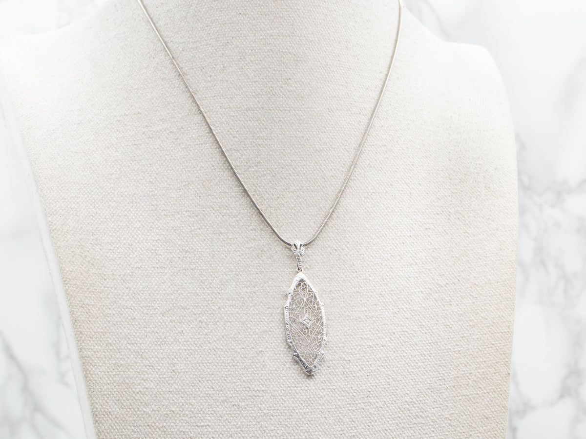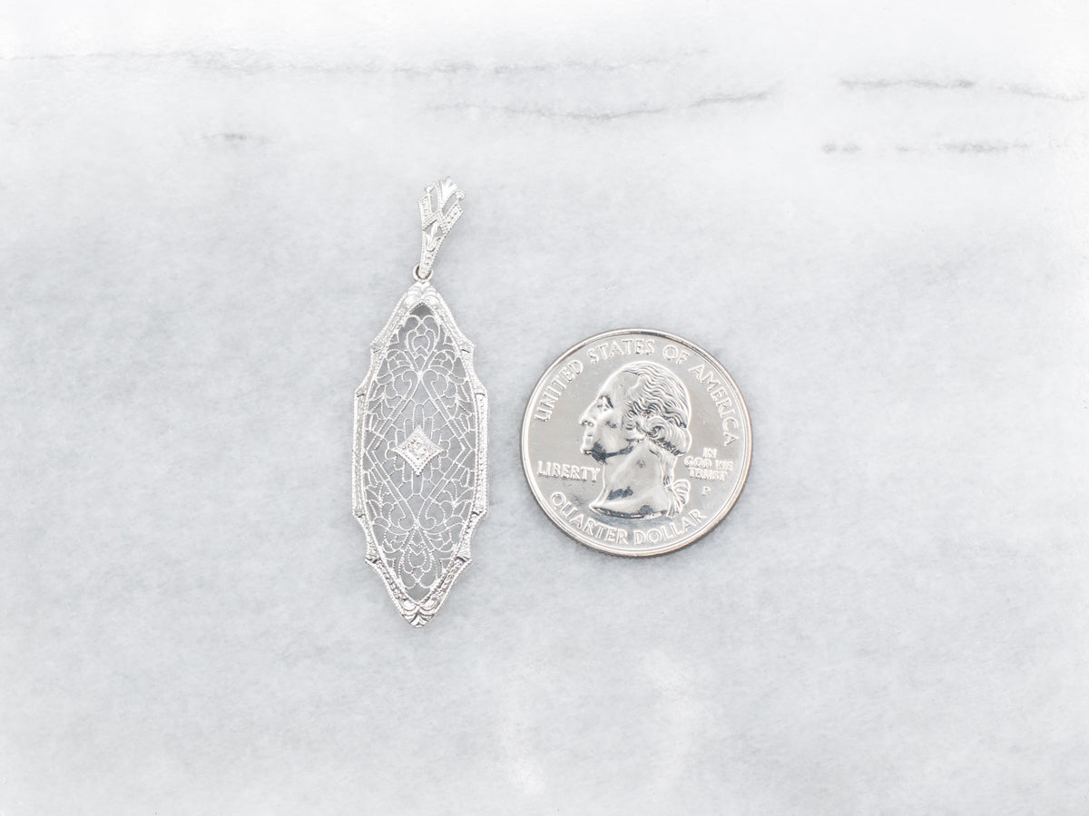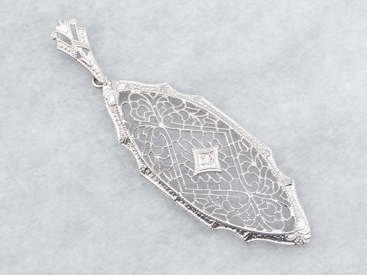 Add a touch of elegance to your outfit with this Art Deco piece! The intricately designed filigree pendant features a dazzling diamond accent that adds a touch of sparkle. Perfect for any occasion, this pendant will make you stand out in style!