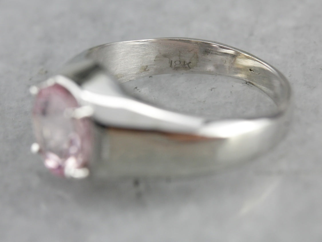 A little more subtle than some of our mens rings, this vintage pink tourmaline ring is simple, with a traditional smooth design for the shoulders and undercarriage. The stone is held securely in place with a very industrial style head, making this piece interesting on the hand.