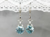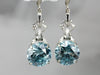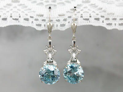 Simply gorgeous! The diamond and white gold mountings that we used for these one of a kind earrings were taken from a Retro Era jewelry piece, giving these new drops a vintage feel! A pretty filigree head combines with four structural prongs to hold a lovely center stone of blue zircon. The prongs both secure and frame the stone, letting plenty of light to shine through!