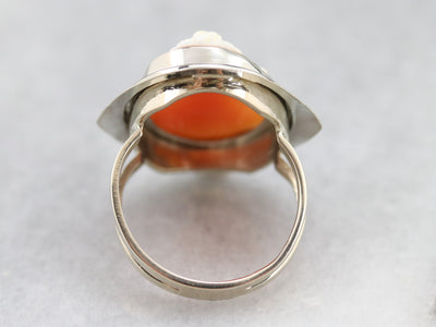 Simply stunning and elegant, this upcycled ring features the well-carved profile of a matron of Ancient Rome. The shell is a deep, rich brown color and the portrait is a clean white, with the elegant woman with a flower in her hair. This cameo is a simple, distinctive statement piece. Cameo is the art of carving a layered material, creating a portrait or landscape in different colors and textures. Shell is the traditional medium for this artwork.