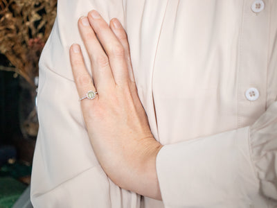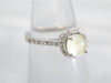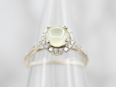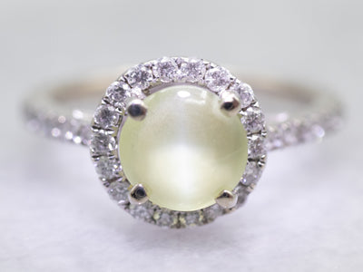 This cat's eye chrysoberyl is exceptionally beautiful! Chartreuse undertones dance with glowing flashes of the palest sea blue, giving the stone an ethereal look. This extraordinary stone is set into a contemporary white gold ring, with diamond accents that glitter and sparkle, throwing light into the center.