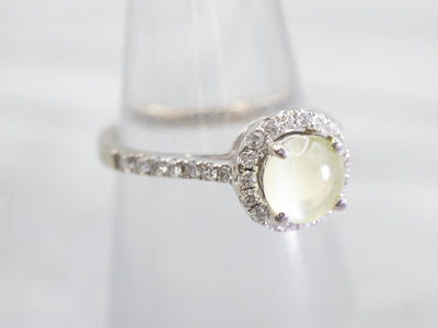 Metal: 14K White Gold Gem: Cat's Eye Chrysoberyl 1.14 Carats Gem Measurements: 6.3 mm, Round Accents: 32 Diamonds totaling .29 Carats, VS-SI in Clarity, G-I in Color Ring Size: 5.25