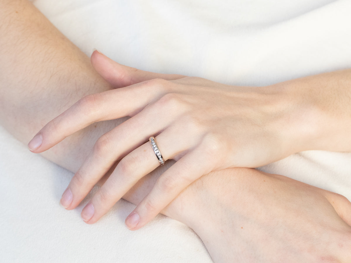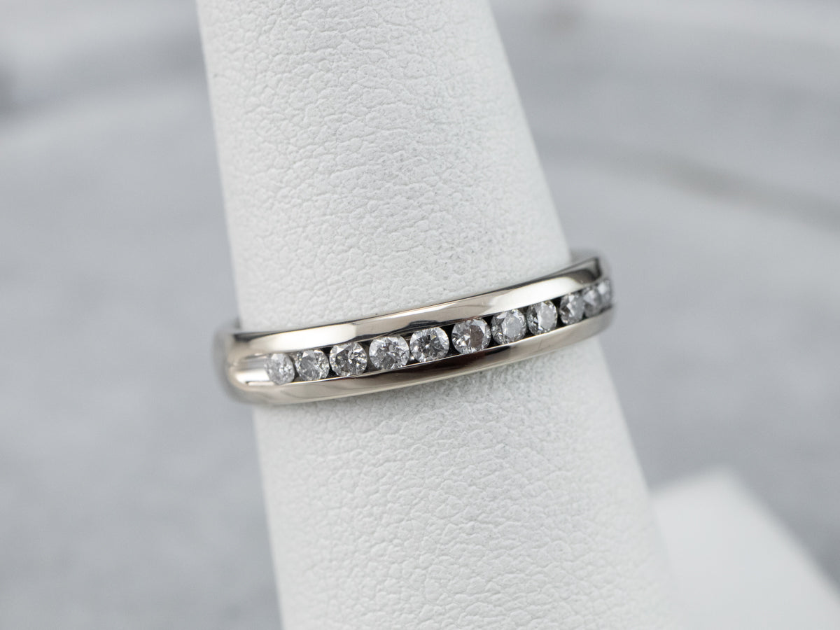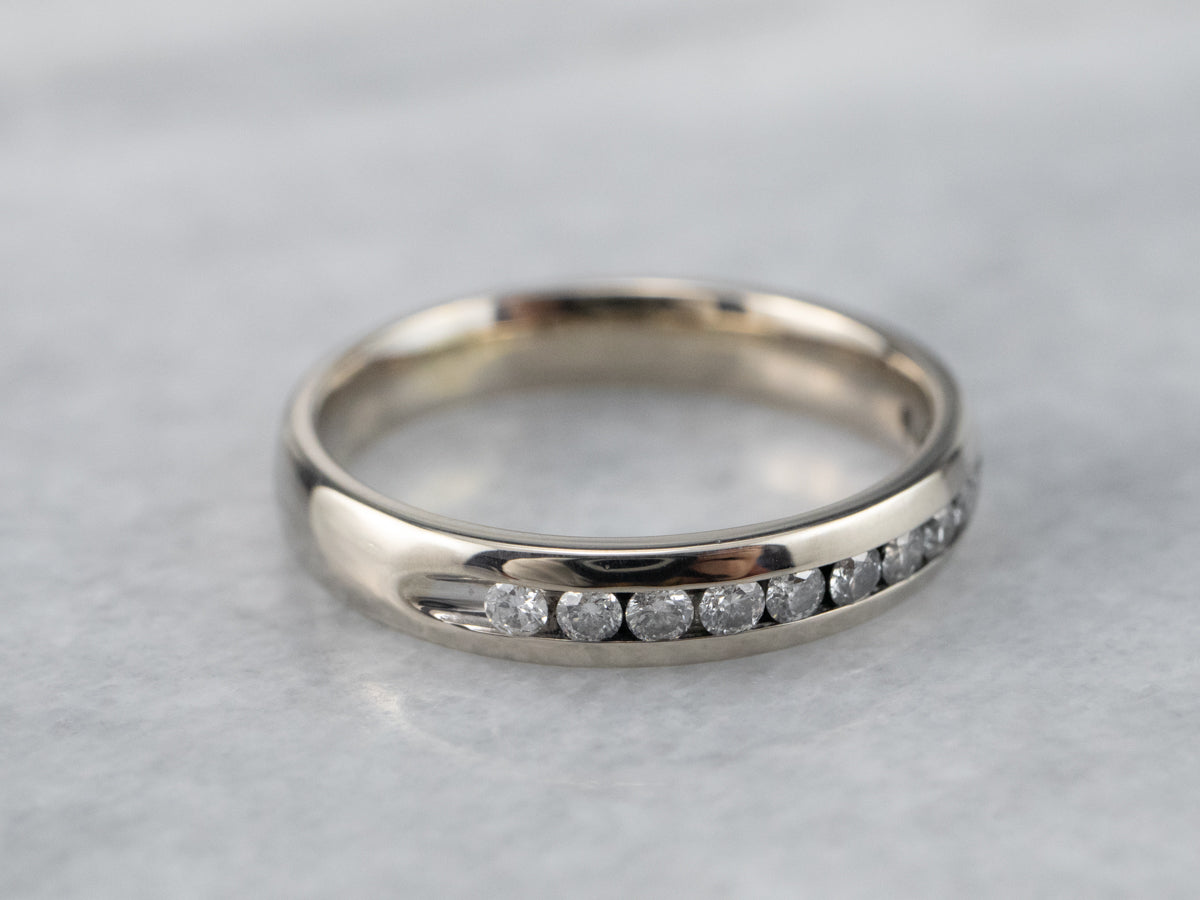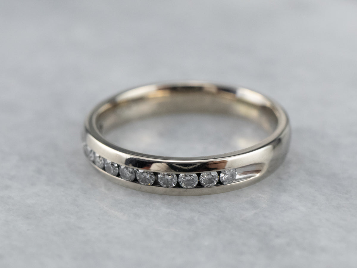 A nice example of this classic style, this ring will look well on a man or a woman! The effect of one long row of diamonds, one band of glittering bright light, across the finger is always popular and always lovely. The sides of the ring completely encase the diamonds, keeping them safe and secure.