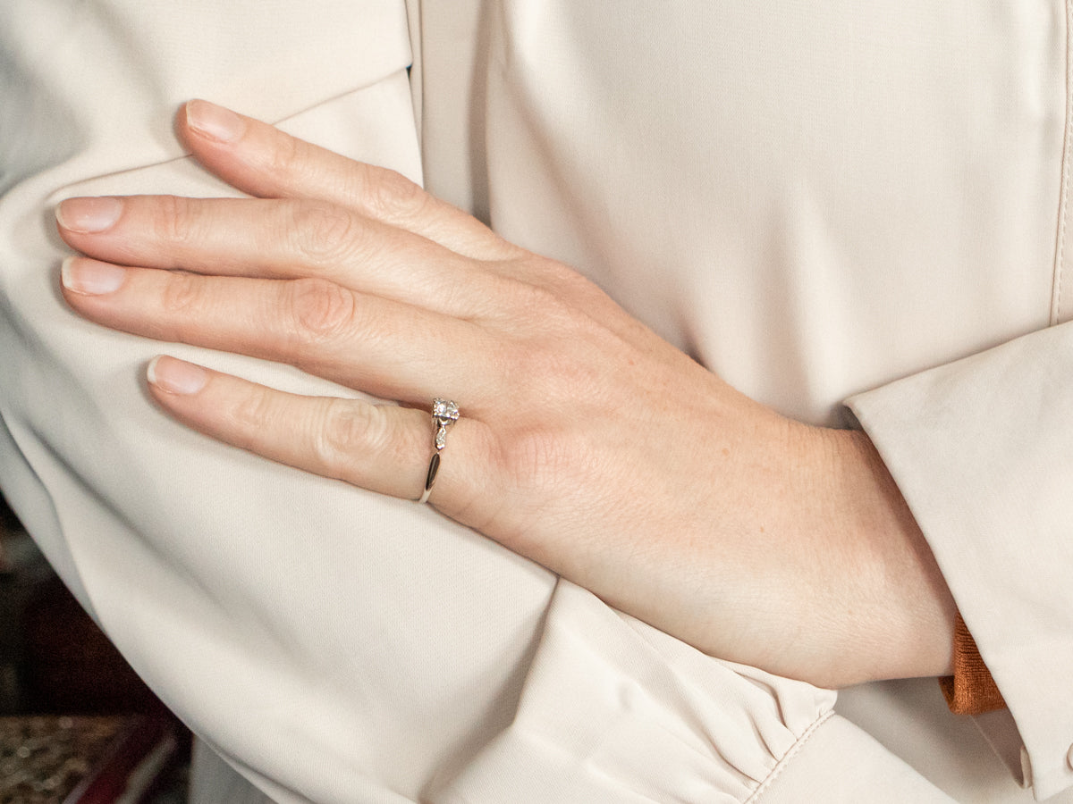 Metal: 14K White Gold Gem: Diamond .45 Carats, I1 in Clarity, F in Color Gem Measurements: 4.8 mm, Round Accents: 2 Diamonds totaling .10 Carats, SI2 in Clarity G in Color Ring Size: 5.50 Marks: "14" Stamped on the inside band