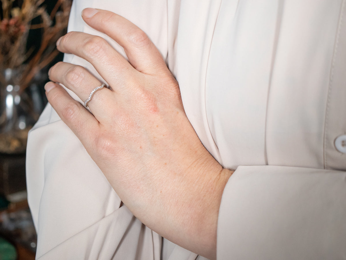 This elegant band is crafted from the finest white gold and set with shimmering diamonds. Its perfect shape ensures a comfortable fit and timeless beauty. Make a statement with this luxurious piece of jewelry.