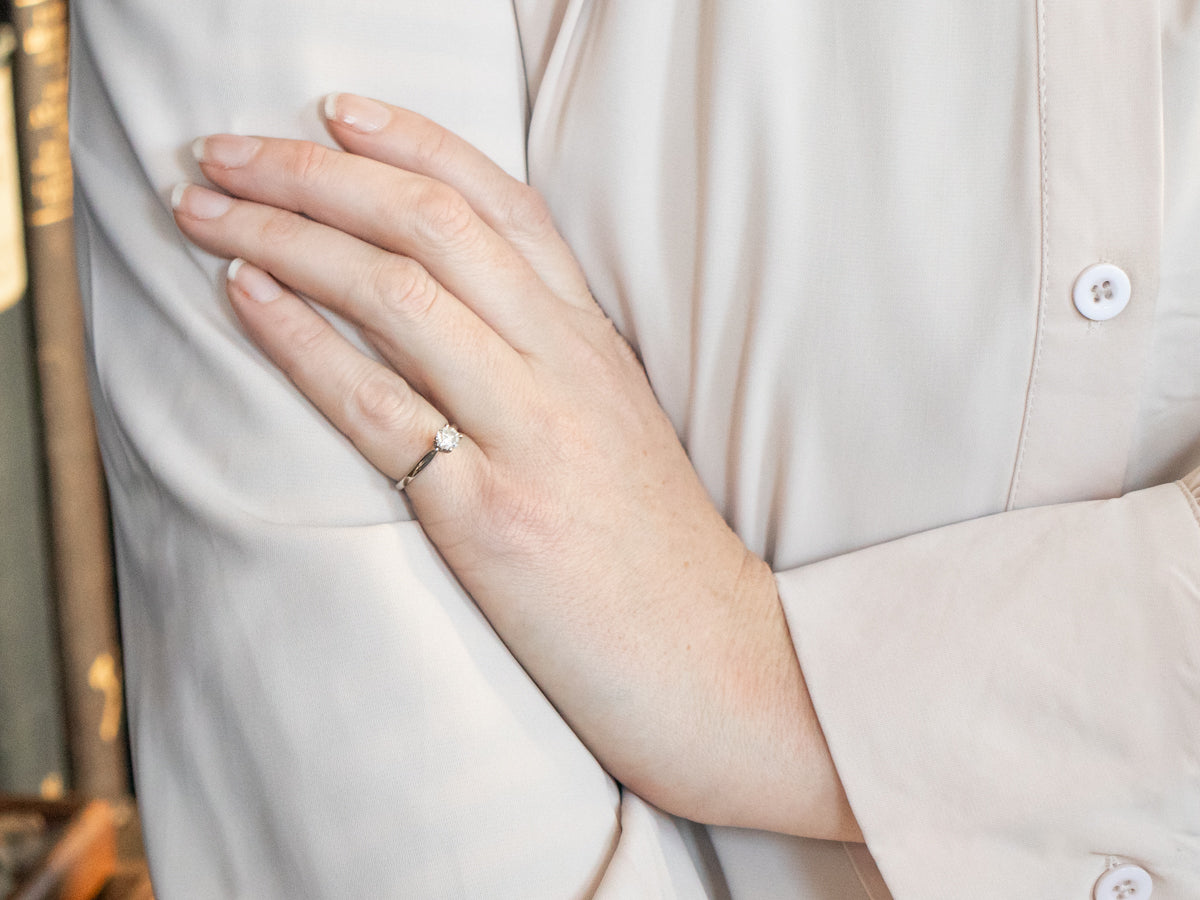 This stunning engagement ring features a stunning glittering round brilliant-cut diamond in a classic solitaire setting. The simple elegance of the white 18-karat gold is perfect for a timeless symbol of love.