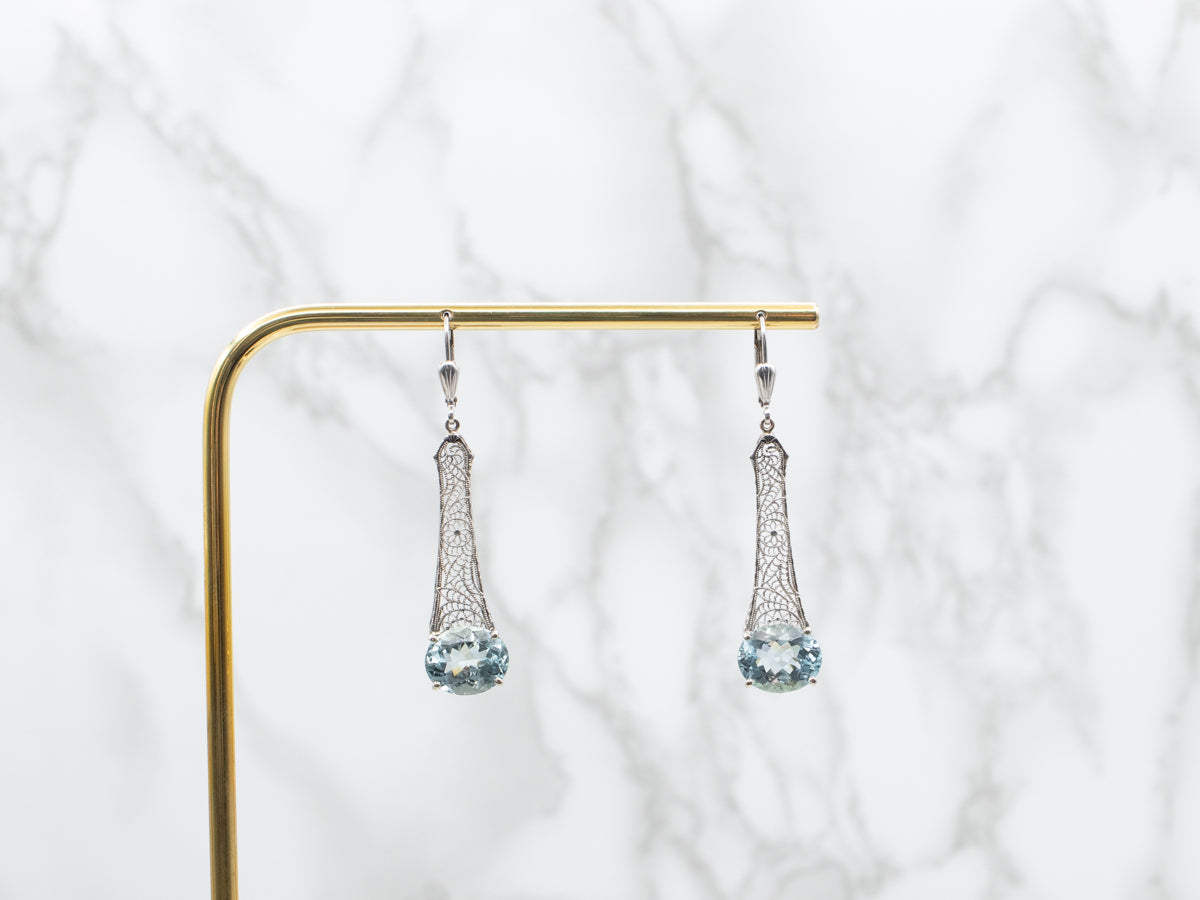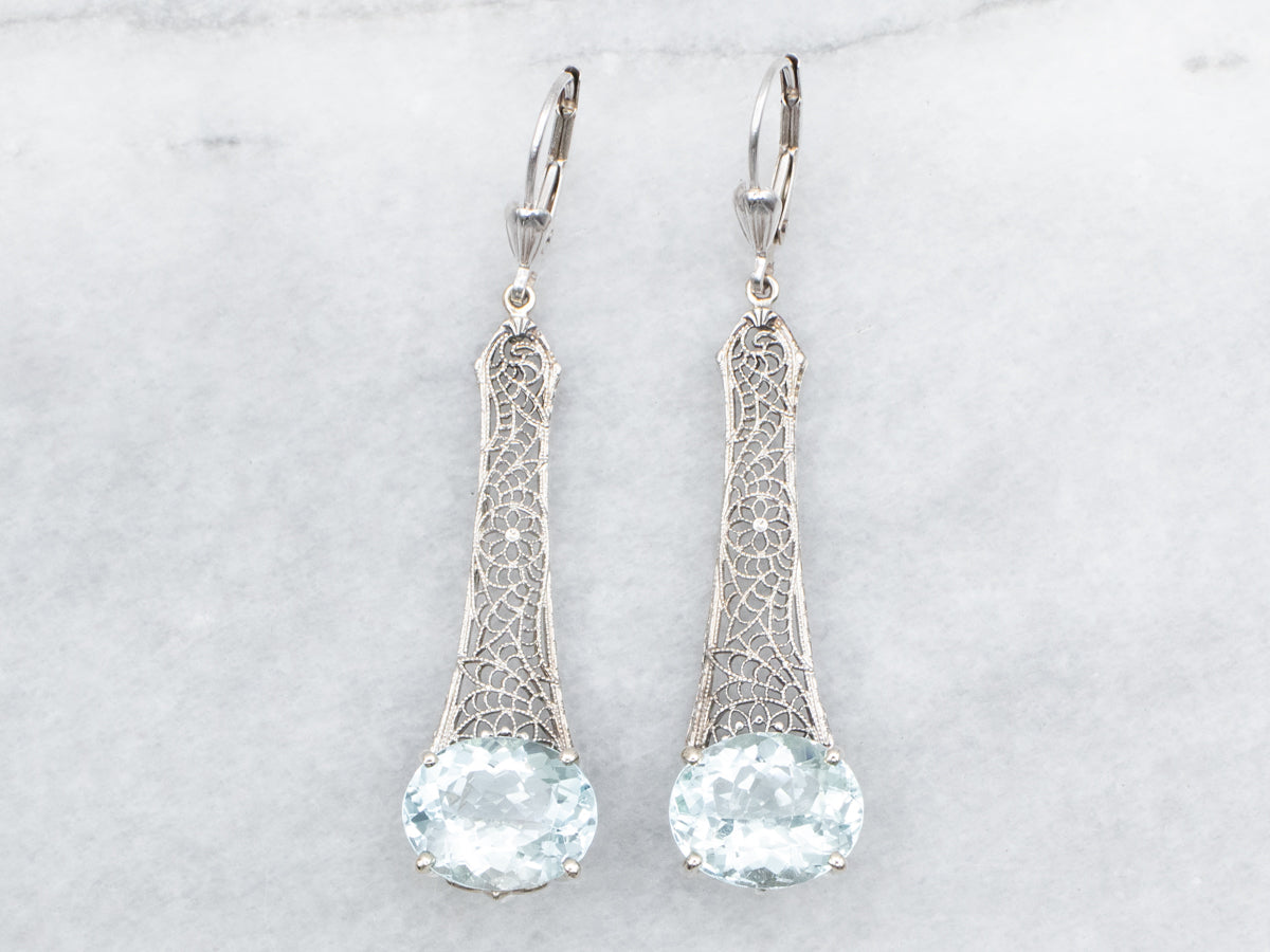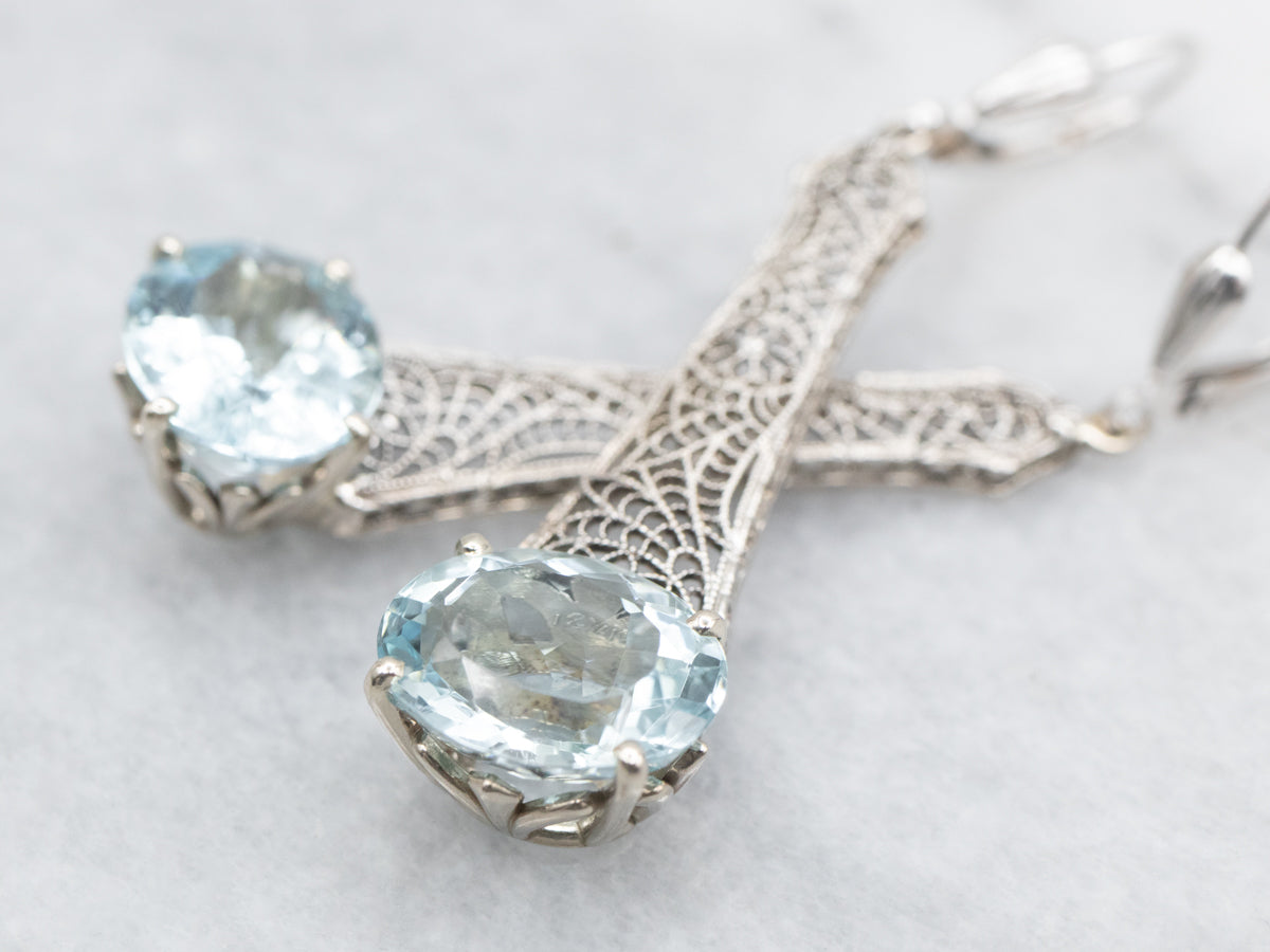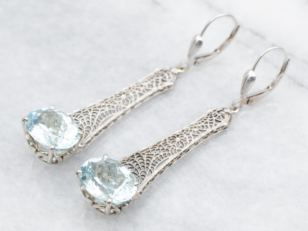 Expertly crafted from white gold, these elegant earrings showcase stunning East to West oval cut Aquamarine gemstones. The intricate filigree design adds a touch of sophistication to these drop earrings, making them the perfect statement piece for any occasion. Elevate your style with the timeless beauty of these earrings!