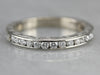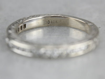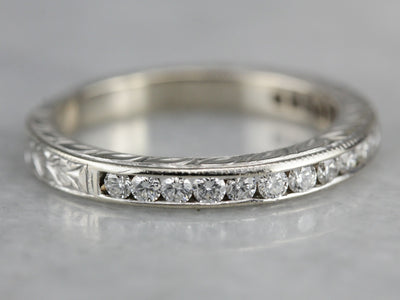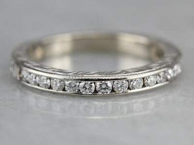 Pretty and sophisticated, this would be a great wedding band for a person who wants a little extra sparkle but works with their hands. This is a vintage channel set diamond wedding band, tapering from larger to smaller sized stones on the edges. We've updated this piece by hand engraving a traditional motif along the undercarriage and shoulders!