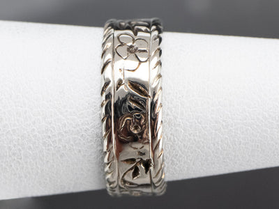 This vintage band dates to the mid-1900s and is well suited to a man or a woman. It's wider than many modern bands, and engraved with a classic flower motif! Perfectly polished and ready to wear, this piece would be a fantastic stacking ring as well!