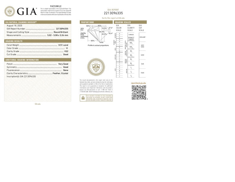 Metal: 14K White Gold Gem: GIA Certified Diamond .51 Carats, VS2 in Clarity, H in Color Gem Measurements: 5.0 mm, Round Accents: 44 Diamonds totaling .40 Carats, SI in Clarity, G in Color Ring Size: 7 Marks: "14K" Stamped on the inside band GIA Report Number: 221********