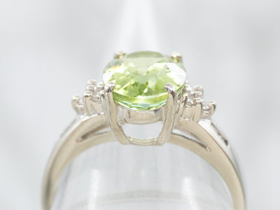 Metal: 14K White Gold Gem: Green Tourmaline 2.52 Carats Gem Measurements: 7.9 x 9.4 mm, Oval Accents: 10 Diamonds totaling .08 Carats, SI in Clarity, G-I in Color Ring Size: 8 Marks: "14K WCO" Stamped on the inside band