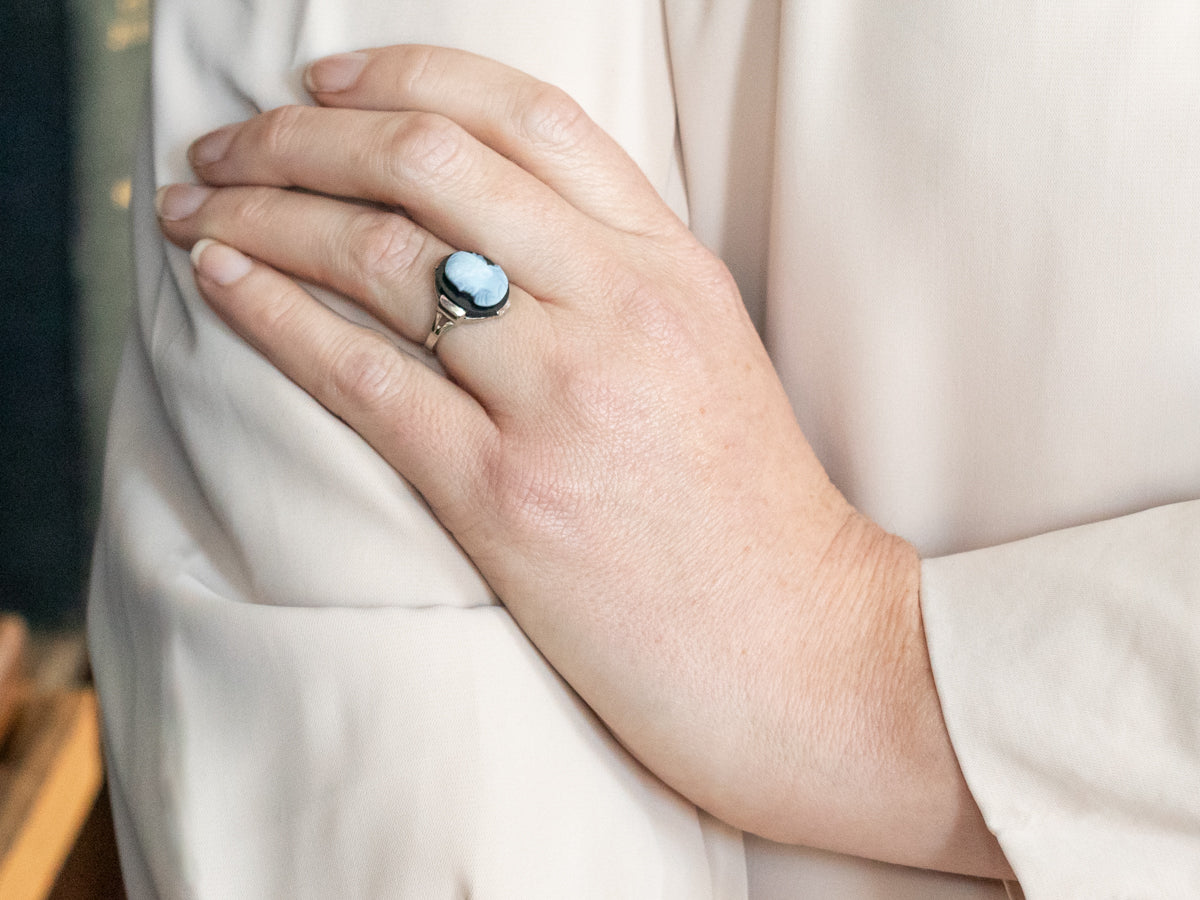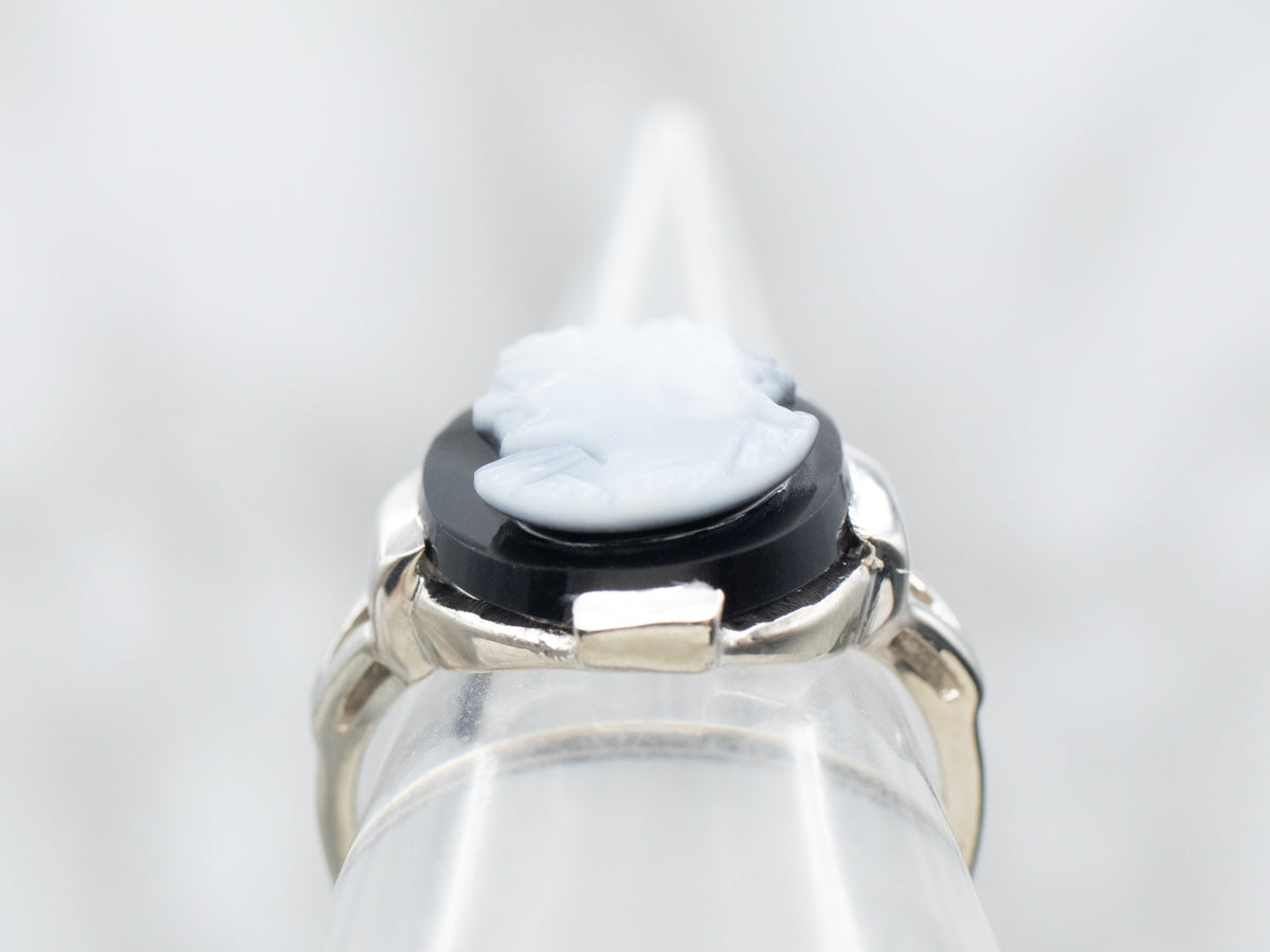 This ring is the perfect piece to bring a touch of timeless glamor to your look. Crafted with a unique onyx cameo and set in luxurious white gold, it's sure to be the show-stopper of your jewelry collection!